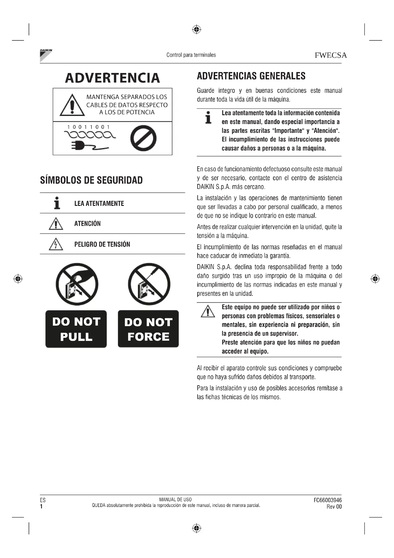 DO NOT PULL DO NOT FORCE ADVERTENCIAS GENERALES Guarde íntegro y en buenas condiciones este manual durante toda la vida útil de la máquina.Lea atentamente toda la información contenida en este manual, dando especial importancia a las partes escritas "Importante" y "Atención" El incumplimiento de las instrucciones puede causar daños a personas o a la máquinaEn caso de funcionamiento defectuoso consulte este manual y de ser necesario, contacte con el centro de asistencia DAIKIN S.p.A. más cercano.La instalación y las operaciones de mantenimiento tienen que ser llevadas a cabo por personal cualificado, a menos de que no se indique lo contrario en este manual.Antes de realizar cualquier intervención en la unidad, quite la tensión a la máquina.El incumplimiento de las normas reseñadas en el manual hace caducar de inmediato la garantía.DAIKIN S.p.A. declina toda responsabilidad frente a todo daño surgido tras un uso impropio de la máquina o del incumplimiento de las normas indicadas en este manual y presentes en la unidad.Este equipo no puede ser utilizado por niños o personas con problemas físicos, sensoriales o mentales, sin experiencia ni preparación, sin la presencia de un supervisor Preste atención para que los niños no puedan acceder al equipo Al recibir el aparato controle sus condiciones y compruebe que no haya sufrido daños debidos al transporte.Para la instalación y uso de posibles accesorios remítase a las fichas técnicas de los mismos.FC66003946 Rev 00