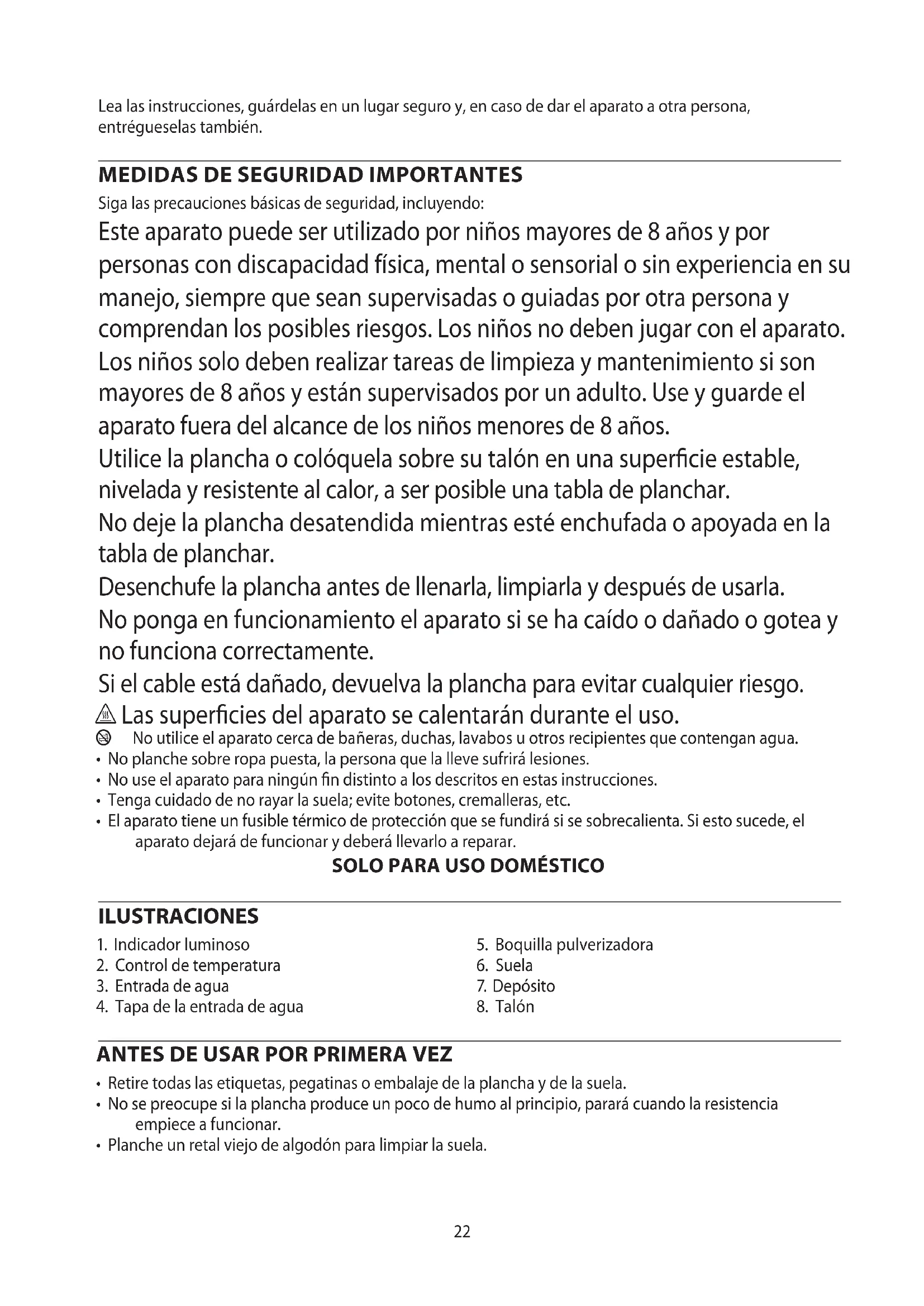 Siga las precauciones básicas de seguridad, incluyendo: Este aparato puede ser utilizado por niños mayores de 8 años y por personas con discapacidad física, mental o sensorial o sin experiencia en su manejo, siempre que sean supervisadas o guiadas por otra persona y comprendan los posibles riesgos. Los niños no deben jugar con el aparato. Los niños solo deben realizar tareas de limpieza y mantenimiento si son mayores de 8 años y están supervisados por un adulto. Use y guarde el aparato fuera del alcance de los niños menores de 8 años. Utilice la plancha o colóquela sobre su talón en una supercie estable, nivelada y resistente al calor, a ser posible una tabla de planchar. No deje la plancha desatendida mientras esté enchufada o apoyada en la tabla de planchar. Desenchufe la plancha antes de llenarla, limpiarla y después de usarla. No ponga en funcionamiento el aparato si se ha caído o dañado o gotea y no funciona correctamente. Si el cable está dañado, devuelva la plancha para evitar cualquier riesgo. h Las supercies del aparato se calentarán durante el uso. b No utilice el aparato cerca de bañeras, duchas, lavabos u otros recipientes que contengan agua.
