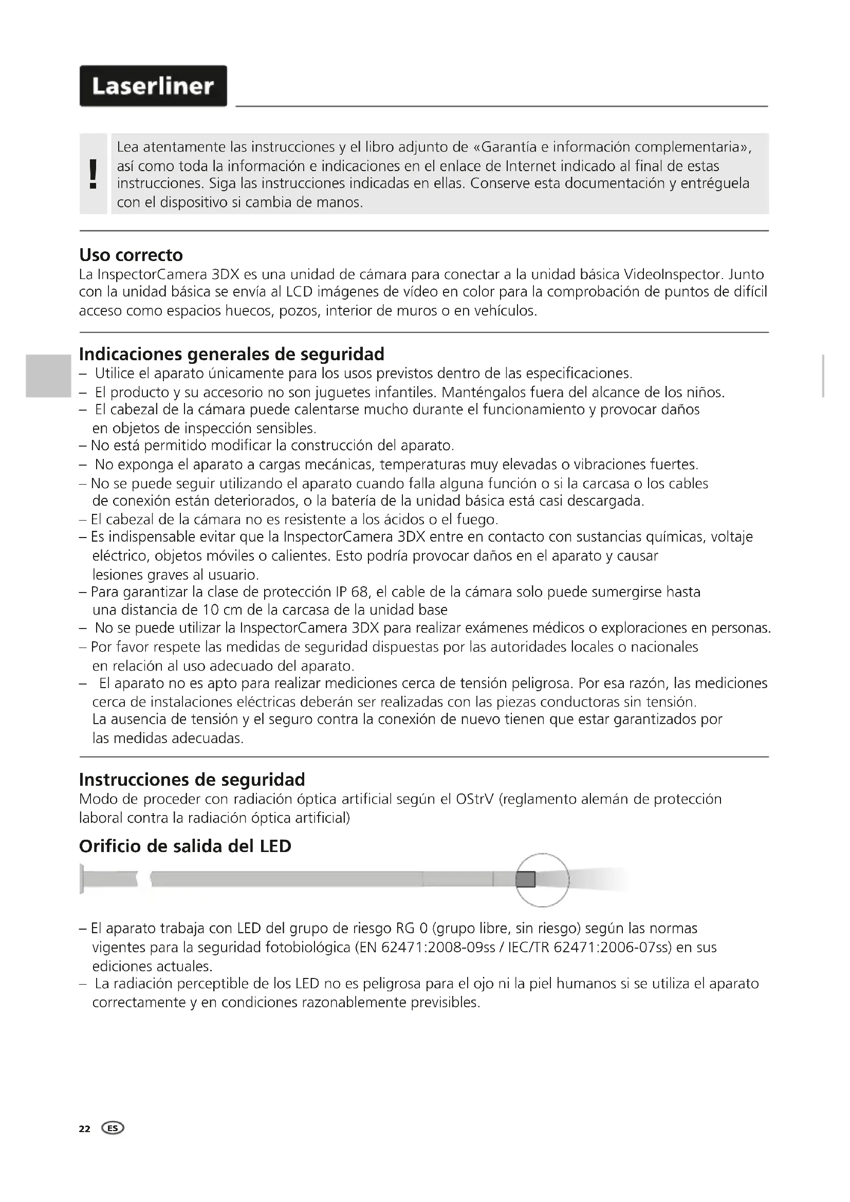 – El aparato trabaja con LED del grupo de riesgo RG 0 (grupo libre, sin riesgo) según las normas vigentes para la seguridad fotobiológica (EN 62471:2008-09ss / IEC/TR 62471:2006-07ss) en sus ediciones actuales. – La radiación perceptible de los LED no es peligrosa para el ojo ni la piel humanos si se utiliza el aparato correctamente y en condiciones razonablemente previsibles. Orificio de salida del LED Instrucciones de seguridad Modo de proceder con radiación óptica artificial según el OStrV (reglamento alemán de protección laboral contra la radiación óptica artificial) Indicaciones generales de seguridad – Utilice el aparato únicamente para los usos previstos dentro de las especicaciones. – El producto y su accesorio no son juguetes infantiles. Manténgalos fuera del alcance de los niños. – El cabezal de la cámara puede calentarse mucho durante el funcionamiento y provocar daños en objetos de inspección sensibles. – No está permitido modicar la construcción del aparato. – No exponga el aparato a cargas mecánicas, temperaturas muy elevadas o vibraciones fuertes. – No se puede seguir utilizando el aparato cuando falla alguna función o si la carcasa o los cables de conexión están deteriorados, o la batería de la unidad básica está casi descargada. – El cabezal de la cámara no es resistente a los ácidos o el fuego. – Es indispensable evitar que la InspectorCamera 3DX entre en contacto con sustancias químicas, voltaje eléctrico, objetos móviles o calientes. Esto podría provocar daños en el aparato y causar lesiones graves al usuario. – Para garantizar la clase de protección IP 68, el cable de la cámara solo puede sumergirse hasta una distancia de 10 cm de la carcasa de la unidad base – No se puede utilizar la InspectorCamera 3DX para realizar exámenes médicos o exploraciones en personas. – Por favor respete las medidas de seguridad dispuestas por las autoridades locales o nacionales en relación al uso adecuado del aparato. – El aparato no es apto para realizar mediciones cerca de tensión peligrosa. Por esa razón, las mediciones cerca de instalaciones eléctricas deberán ser realizadas con las piezas conductoras sin tensión. La ausencia de tensión y el seguro contra la conexión de nuevo tienen que estar garantizados por las medidas adecuadas. Uso correcto La InspectorCamera 3DX es una unidad de cámara para conectar a la unidad básica VideoInspector. Junto con la unidad básica se envía al LCD imágenes de vídeo en color para la comprobación de puntos de difícil acceso como espacios huecos, pozos, interior de muros o en vehículos. Lea atentamente las instrucciones y el libro adjunto de «Garantía e información complementaria», así como toda la información e indicaciones en el enlace de Internet indicado al final de estas instrucciones. Siga las instrucciones indicadas en ellas. Conserve esta documentación y entréguela con el dispositivo si cambia de manos. !InspectorCamera 3DX