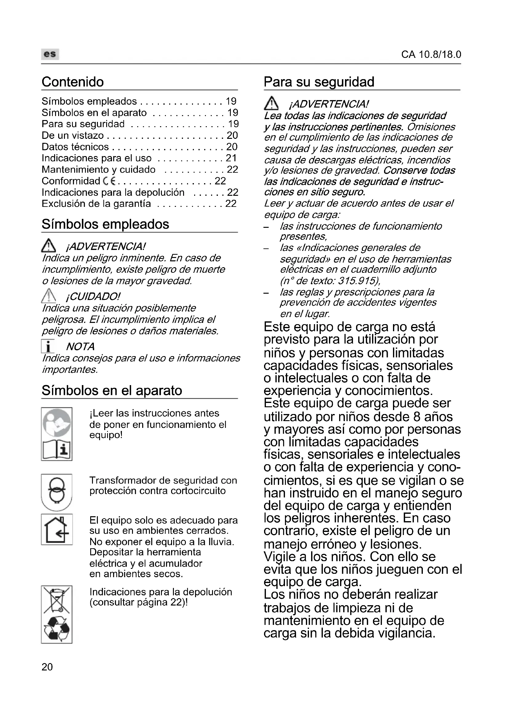 las reglas y prescripciones para la prevención de accidentes vigentes en el lugar. Este equipo de carga no está previsto para la utilización por niños y personas con limitadas capacidades físicas, sensoriales o intelectuales o con falta de experiencia y conocimientos. Este equipo de carga puede ser utilizado por niños desde 8 años y mayores así como por personas con limitadas capacidades físicas, sensoriales e intelectuales o con falta de experiencia y cono- cimientos, si es que se vigilan o se han instruido en el manejo seguro del equipo de carga y entienden los peligros inherentes. En caso contrario, existe el peligro de un manejo erróneo y lesiones. Vigile a los niños. Con ello se evita que los niños jueguen con el equipo de carga. Los niños no deberán realizar trabajos de limpieza ni de mantenimiento en el equipo de carga sin la debida vigilancia.CA 10.8/18.0