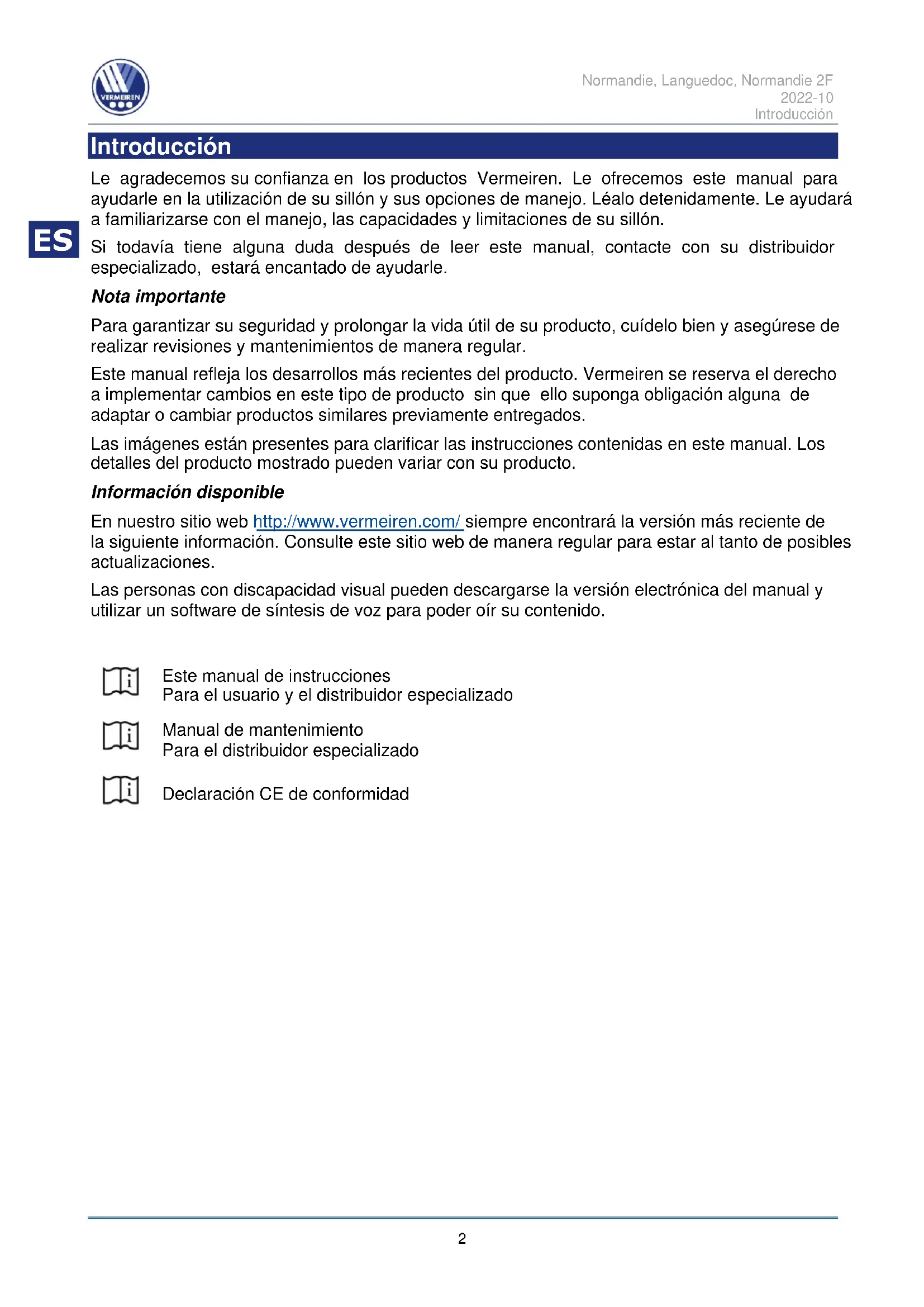 Introducción Le agradecemos su confianza en los productos Vermeiren. Le ofrecemos este manual para ayudarle en la utilización de su sillón y sus opciones de manejo. Léalo detenidamente. Le ayudará a familiarizarse con el manejo, las capacidades y limitaciones de su sillón. Si todavía tiene alguna duda después de leer este manual, contacte con su distribuidor especializado, estará encantado de ayudarle. Nota importante Para garantizar su seguridad y prolongar la vida útil de su producto, cuídelo bien y asegúrese de realizar revisiones y mantenimientos de manera regular. Este manual refleja los desarrollos más recientes del producto. Vermeiren se reserva el derecho a implementar cambios en este tipo de producto sin que ello suponga obligación alguna de adaptar o cambiar productos similares previamente entregados. Las imágenes están presentes para clarificar las instrucciones contenidas en este manual. Los detalles del producto mostrado pueden variar con su producto. Información disponible En nuestro sitio web http://www.vermeiren.com/ siempre encontrará la versión más reciente de la siguiente información. Consulte este sitio web de manera regular para estar al tanto de posibles actualizaciones. Las personas con discapacidad visual pueden descargarse la versión electrónica del manual y utilizar un software de síntesis de voz para poder oír su contenido.