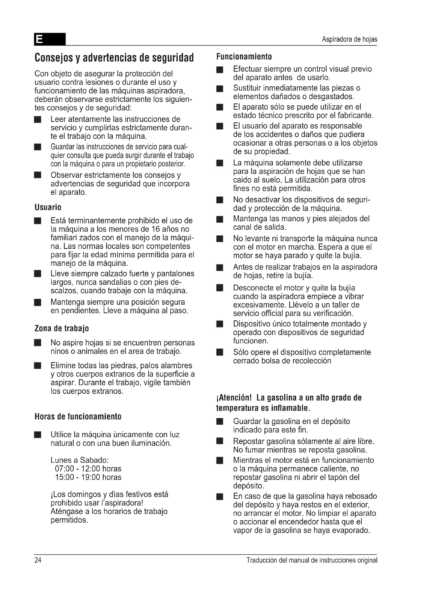 Aspiradora de hojas Con objeto de asegurar la protección del usuario contra lesiones o durante el uso y funcionamiento de las máquinas aspiradora, deberán observarse estrictamente los siguien- tes consejos y de seguridad: Consejos y advertencias de seguridad Leer atentamente las instrucciones de servicio y cumplirlas estrictamente duran- te el trabajo con la máquina. Guardar las instrucciones de servicio para cual- quier consulta que pueda surgir durante el trabajo con la máquina o para un propietario posterior. Observar estrictamente los consejos y advertencias de seguridad que incorpora el aparato. Usuario Está terminantemente prohibido el uso de la máquina a los menores de 16 años no familiari zados con el manejo de la máqui- na. Las normas locales son competentes para jar la edad mínima permitida para el manejo de la máquina. Lleve siempre calzado fuerte y pantalones largos, nunca sandalias o con pies de- scalzos, cuando trabaje con la máquina. Zona de trabajo No aspire hojas si se encuentren personas ninos o animales en el area de trabajo. Elimine todas las piedras, palos alambres y otros cuerpos extranos de la supercie a aspirar. Durante el trabajo, vigile tambièn los cuerpos extranos. Horas de funcionamiento Utilice la máquina ùnicamente con luz natural o con una buen iluminación. Lunes a Sabado: 07:00 - 12:00 horas 15:00 - 19:00 horas ¡Los domingos y dìas festivos está prohibido usar l’aspiradora! Aténgase a los horarios de trabajo permitidos. Mantenga siempre una posición segura en pendientes. Lleve a máquina al paso. Funcionamiento Efectuar siempre un control visual previo del aparato antes de usarlo. Sustituir inmediatamente las piezas o elementos dañados o desgastados. El aparato sólo se puede utilizar en el estado técnico prescrito por el fabricante. El usuario del aparato es responsable de los accidentes o daños que pudiera ocasionar a otras personas o a los objetos de su propiedad. La máquina solamente debe utilizarse para la aspiraciòn de hojas que se han caido al suelo. La utilizaciòn para otros nes no está permitida. No desactivar los dispositivos de seguri- dad y protección de la máquina. Mantenga las manos y pies alejados del canal de salida. No levante ni transporte la máquina nunca con el motor en marcha. Espera a que el motor se haya parado y quite la bujía. Antes de realizar trabajos en la aspiradora de hojas, retire la bujía. Desconecte el motor y quite la bujía cuando la aspiradora empiece a vibrar excesivamente. Llévelo a un taller de servicio ofcial para su vericación. ¡Atención! La gasolina a un alto grado de temperatura es inflamable. Guardar la gasolina en el depósito indicado para este n. Repostar gasolina sólamente al aire libre. No fumar mientras se reposta gasolina. Mientras el motor está en funcionamiento o la máquina permanece caliente, no repostar gasolina ni abrir el tapón del depósito. En caso de que la gasolina haya rebosado del depósito y haya restos en el exterior, no arrancar el motor. No limpiar el aparato o accionar el encendedor hasta que el vapor de la gasolina se haya evaporado. Dispositivo único totalmente montado y operado con dispositivos de seguridad funcionen. Sólo opere el dispositivo completamente cerrado bolsa de recolecciónE 25528123_i Para cumplir con las medidas de seguri- dad, cambiar el depósito de gasolina y el tapón en caso de que estén dañados. Con el n de que no se derrame gasolina sobre el motor , sobre la carcassa, utilizar un embudo o un tubo de relleno para introducir la gasolina. ¡Peligro de quemaduras! El tubo de escape y las zonas más cercanas pueden llegar a alcanzar los 80°C de temperatura. Cambiar los si- lenciadores en caso de quen estén dañados. No modicar los valores del regulador del motor. No dejar en funcionamiento el motor de combustión en lugares cerrados - ¡Peligro de asxia! Repuestos y accesorios Tan sólo se utilizarán repuestos y acceso- rios originales del fabricante. Nos reservamos el derecho de introdu- cir modicaciones constructivas y de ejecución. En las presentes instrucciones de uso ¡Peligro! El incumplimiento de esta adver- tencia puede provocar lesiones en el usuario de la máquina. Montaje Para efectuar el montaje del aparato deberán observerse estrictamente las instrucciones de montaje suministradas con el aparato. Dispositivos de seguridad Palanca de seguridad Soltar la palanca de seguridad en caso de peligro: El motor y la impeledor se paran. ¡No anular en ningùn caso la función de la palanca de seguridad! Simbolos en el aparato ¡Lea las instrucciones de manejo! ¡Mantenga alejadas a las personas presentes! Antes de realizar trabajos en la aspiradora de hojas, retire la bujía. ¡Attención peligro! Mantenga las manos y pies alejados del canal de salida. La cifra situada en el lado izquierdo del texto se reere al número del dibujo, por ejemplo: Consejos para preservar el medio am- biente / Eliminación del embalaje ¡No elimine las máquinas fuera de uso con los residuos domésticos! Los embalajes, la máquina y los accesorios están fabricados con materiales reciclabes y deben desecharse adecuadamente. Puesta en marcha Poner el aparato en marcha sólo una vez que se ha completado el montaje de todas sus piezas y elementos.