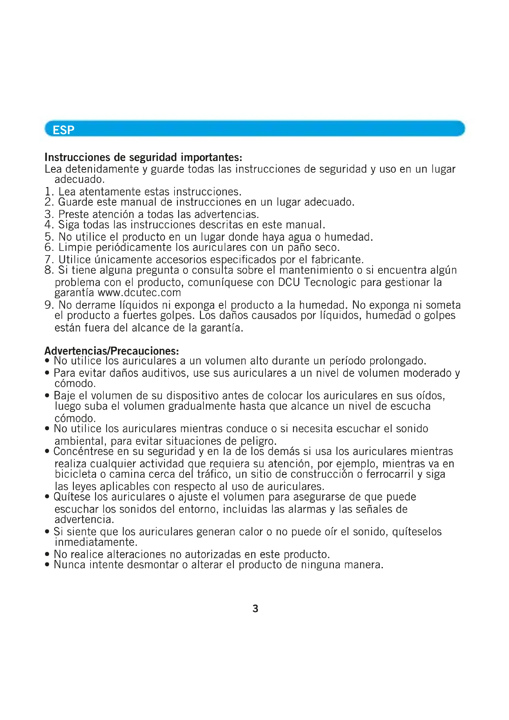 - Este producto contiene material magnético. Mantenga el producto alejado de productos magnéticos sensibles (como tarjetas de crédito y pantallas de video) para evitar daños Seguridad auditiva: Peligro Para evitar dañar su audición, no escuche a un volumen alto durante mucho tiempo. Ajuste el volumen a un rango seguro. Si el volumen de los auriculares es demasiado alto, se debe acortar el tiempo de uso. Servicio postventa: Este producto está cubierto por la garantía por un período de 3 años de mantenimiento gratuito y políticas de devolución incondicional de 30 días. Si tiene algún problema de calidad sobre el producto comuníquese con DCU Tecnologic en www.dcutec.com Parámetros del producto: Versión Bluetooth: V5.0/5,2 Chipset: Bluetrum 8922E Crystal-Clear Calling Cancelación de ruido: FEEDFORWARD FF Profundidad de reducción de ruido: -25~-28dB Distancia de trabajo: 10-15m sin obstáculos Clasificación a prueba de agua: IPX5 Tiempo de trabajo: Música 8h, tiempo de conversación 8h (70% volumen) Tiempo de carga: Estuche de carga 2h, auriculares 1h Capacidad de la batería: 400mAH, auricular único 50mAH Altavoces: 10 mm, 32 Ω, S/N: ≥100 dB Corriente de trabajo: 7mA ESP 3Instrucciones de seguridad importantes: Lea detenidamente y guarde todas las instrucciones de seguridad y uso en un lugar adecuado.