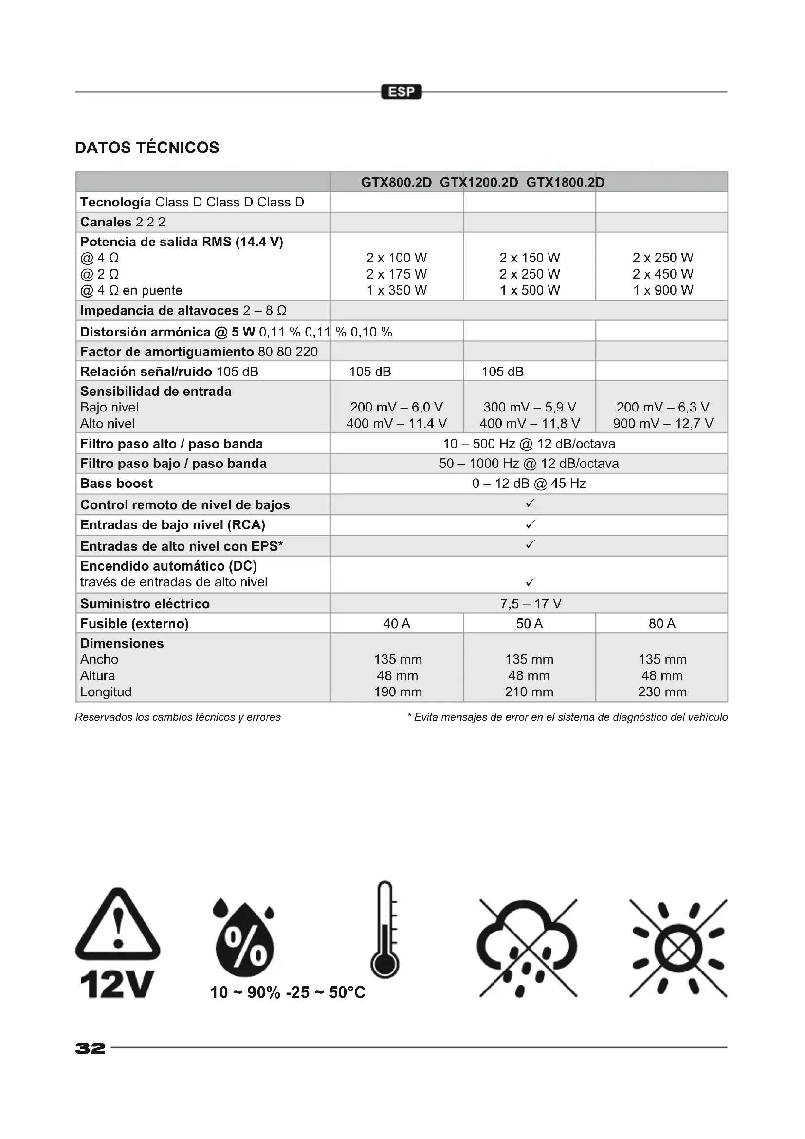 Tecnología Class D Class D Class D Canales 2 2 2 Potencia de salida RMS (14.4 V) @ 4 Ω @ 2 Ω @ 4 Ω en puente 2 x 100 W 2 x 175 W 1 x 350 W 2 x 150 W 2 x 250 W 1 x 500 W 2 x 250 W 2 x 450 W 1 x 900 W Impedancia de altavoces 2 – 8 Ω Distorsión armónica @ 5 W 0,11 % 0,11 % 0,10 % Factor de amortiguamiento 80 80 220 Relación señal/ruido 105 dB 105 dB 105 dB Sensibilidad de entrada Bajo nivel Alto nivel 200 mV – 6,0 V 400 mV – 11.4 V 300 mV – 5,9 V 400 mV – 11,8 V 200 mV – 6,3 V 900 mV – 12,7 V Filtro paso alto / paso banda 10 – 500 Hz @ 12 dB/octava Filtro paso bajo / paso banda 50 – 1000 Hz @ 12 dB/octava Bass boost 0 – 12 dB @ 45 Hz Control remoto de nivel de bajos