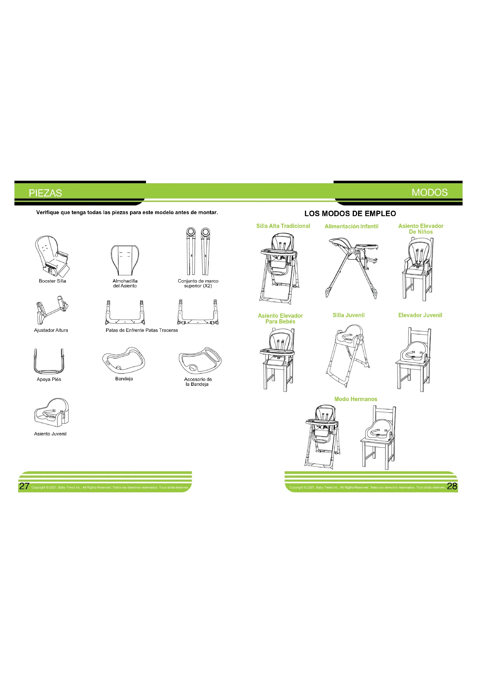 Copyright © 2021, Baby Trend Inc., All Rights Reserved. Todos los derechos reservados. Tous droits réservés. Copyright © 2021, Baby Trend Inc., All Rights Reserved. Todos los derechos reservados. Tous droits réservés. IMPORTANTE! Para garantizar la operación segura del producto, siga estas instrucciones cuidadosamente. Conserve estas instrucciones para consultarlas en el futuro. IMPORTANTE! Antes del armado y de cada uso, examine el producto para detectar accesorios dañados, uniones ojas, piezas ausentes o bordes puntiagudos. NUNCA utilice la silla con piezas ausentes o rotas. IMPORTANTE! Un adulto debe armar el equipo. IMPORTANTE! Controle siempre que la silla alta esté trabada en la posición abierta antes de usarla. ATENCIÓN: Retire cuidadosamente las piezas de la caja. Antes de armar la silla alta, verique que tenga todas las piezas de este modelo.