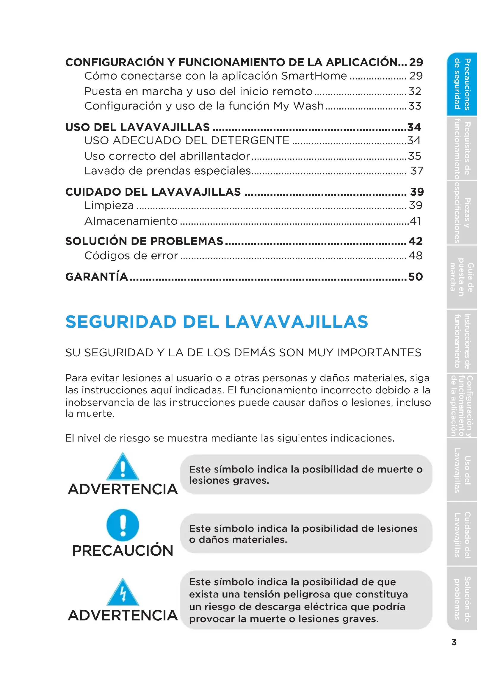Precauciones de seguridadRequisitos de funcionamientoPiezas y especificacionesGuía de puesta en marchaInstrucciones de funcionamientoConfiguración y funcionamiento de la aplicaciónUso del LavavajillasCuidado del LavavajillasSolución de problemas