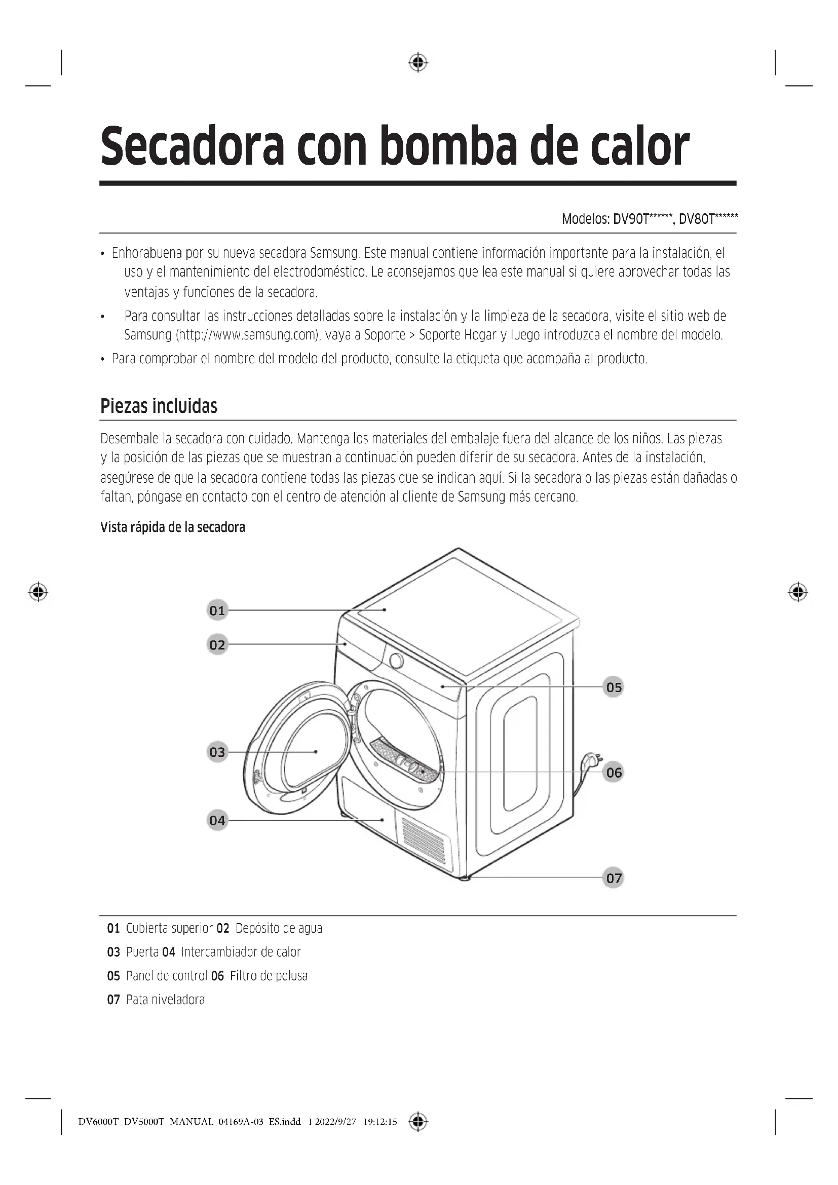 01 Cubierta superior 02 Depósito de agua 03 Puerta 04 Intercambiador de calor 05 Panel de control 06 Filtro de pelusa 07 Pata niveladora DV6000T_DV5000T_MANUAL_04169A-03_ES.indd 1 2022/9/27 19:12:15Español2 Accesorios (suministrados) Guía de la manguera Sujetacables Conector de la manguera Manguera de desagüe larga (2 m) Cesta de secado (solo modelos aplicables) Cepillo de limpieza Accesorios (no suministrados) Abrazadera del kit apilamiento (Pieza SK-DH; SK-DA; SKK-DF) NOTA