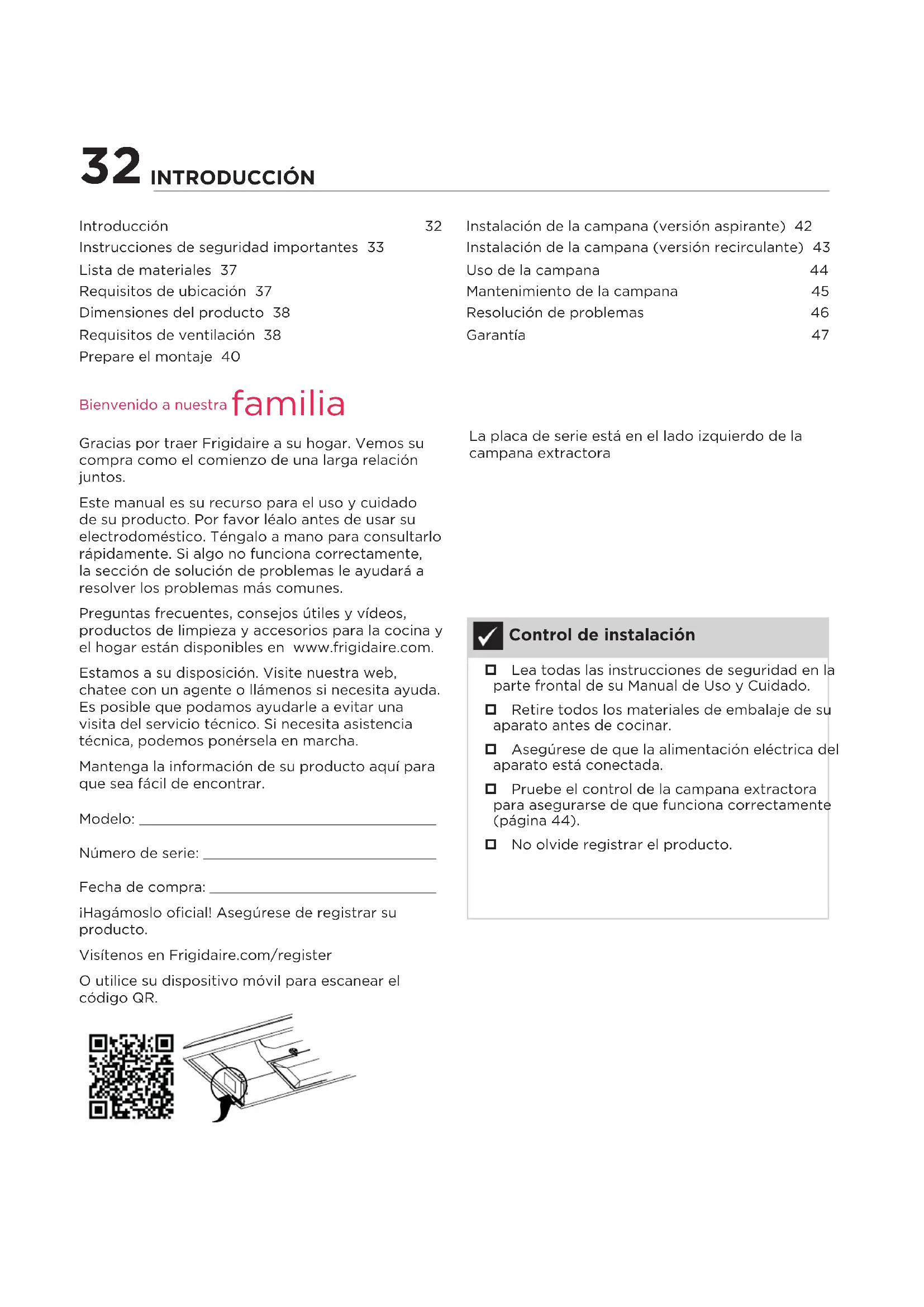 Electrolux Canada Corp. 5855 Terry Fox Way Mississauga, Ontario, Canada L5V 3E4 GARANTIE32 Bienvenido a nuestra familia Gracias por traer Frigidaire a su hogar. Vemos su compra como el comienzo de una larga relación juntos. Este manual es su recurso para el uso y cuidado de su producto. Por favor léalo antes de usar su electrodoméstico. Téngalo a mano para consultarlo rápidamente. Si algo no funciona correctamente, la sección de solución de problemas le ayudará a resolver los problemas más comunes. Preguntas frecuentes, consejos útiles y vídeos, productos de limpieza y accesorios para la cocina y el hogar están disponibles en www.frigidaire.com. Estamos a su disposición. Visite nuestra web, chatee con un agente o llámenos si necesita ayuda. Es posible que podamos ayudarle a evitar una visita del servicio técnico. Si necesita asistencia técnica, podemos ponérsela en marcha. Mantenga la información de su producto aquí para que sea fácil de encontrar. Modelo: Número de serie: Fecha de compra: ¡Hagámoslo oficial! Asegúrese de registrar su producto. Visítenos en Frigidaire.com/register O utilice su dispositivo móvil para escanear el código QR. Lea todas las instrucciones de seguridad en la parte frontal de su Manual de Uso y Cuidado. Retire todos los materiales de embalaje de su aparato antes de cocinar. Asegúrese de que la alimentación eléctrica del aparato está conectada. Pruebe el control de la campana extractora para asegurarse de que funciona correctamente (página 44). No olvide registrar el producto. Control de instalación La placa de serie está en el lado izquierdo de la campana extractora Introducción 32 Instrucciones de seguridad importantes 33 Lista de materiales 37 Requisitos de ubicación 37 Dimensiones del producto 38 Requisitos de ventilación 38 Prepare el montaje 40 Instalación de la campana (versión aspirante) 42 Instalación de la campana (versión recirculante) 43 Uso de la campana 44 Mantenimiento de la campana 45 Resolución de problemas 46 Garantía 47 INTRODUCCIÓN33