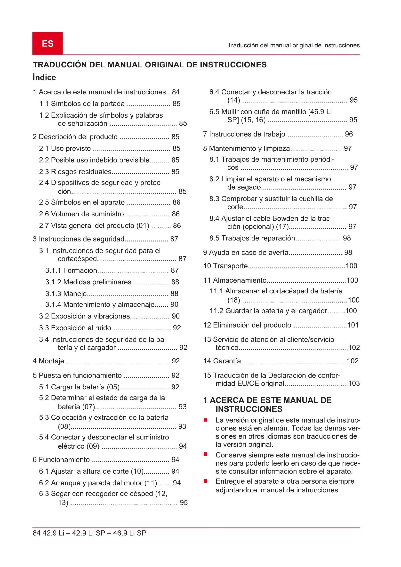 94,2dB(A)/96dB(A)ES 84 42.9 Li – 42.9 Li SP – 46.9 Li SP Traducción del manual original de instrucciones TRADUCCIÓN DEL MANUAL ORIGINAL DE INSTRUCCIONES Índice 1 Acerca de este manual de instrucciones . 84