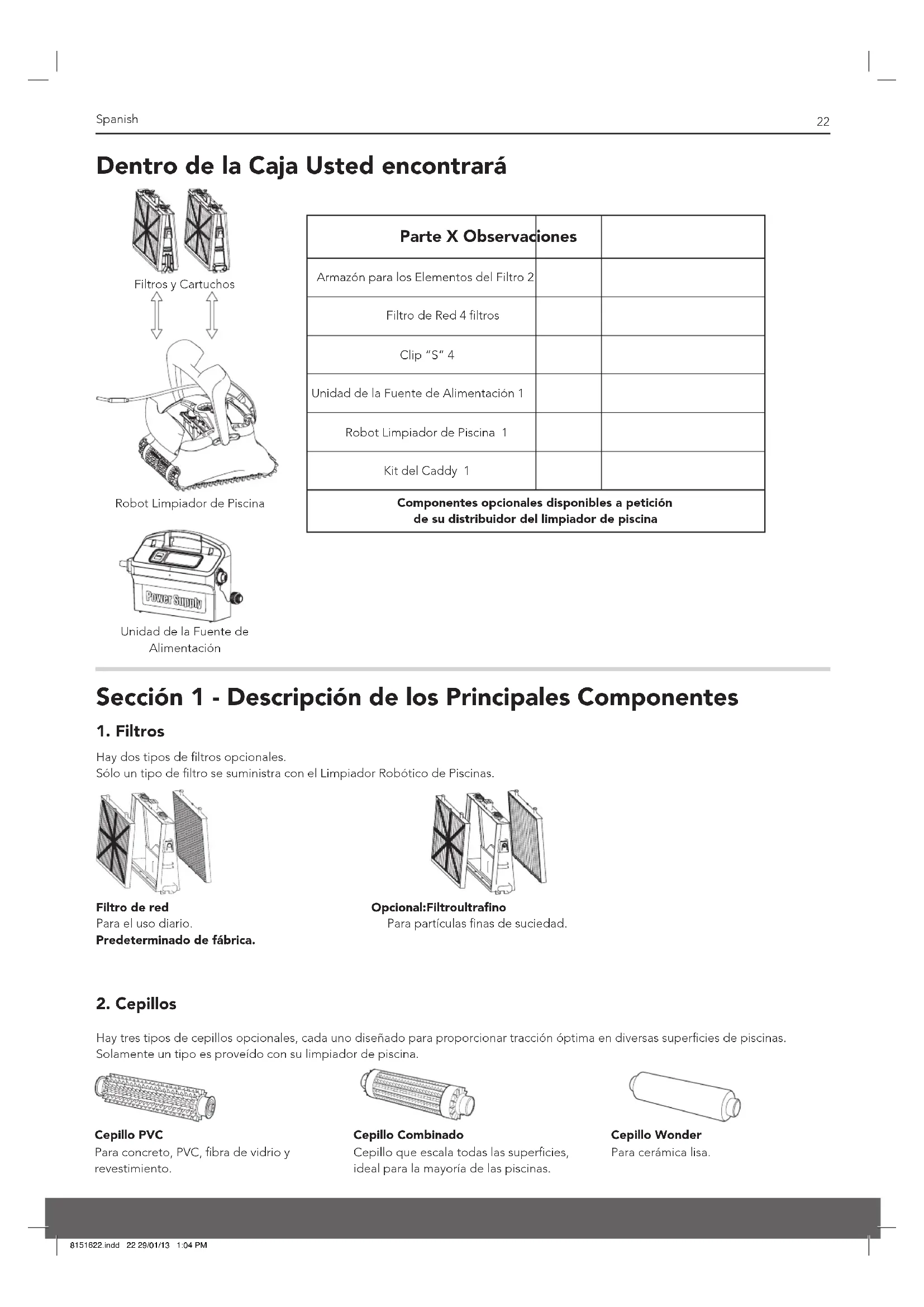 Hay tres tipos de cepillos opcionales, cada uno diseñado para proporcionar tracción óptima en diversas superficies de piscinas. Solamente un tipo es proveído con su limpiador de piscina.Cepillo PVC Para concreto, PVC, fibra de vidrio y revestimiento. Cepillo Combinado Cepillo que escala todas las superficies, ideal para la mayoría de las piscinas.Cepillo Wonder Para cerámica lisa.Unidad de la Fuente de Alimentación Robot Limpiador de Piscina Filtros y Cartuchos click click click click click click click click Opcional: Filtro ultra fino Para partículas finas de suciedad.8151622.indd 22 29/01/13 1:04 PM23 Spanish