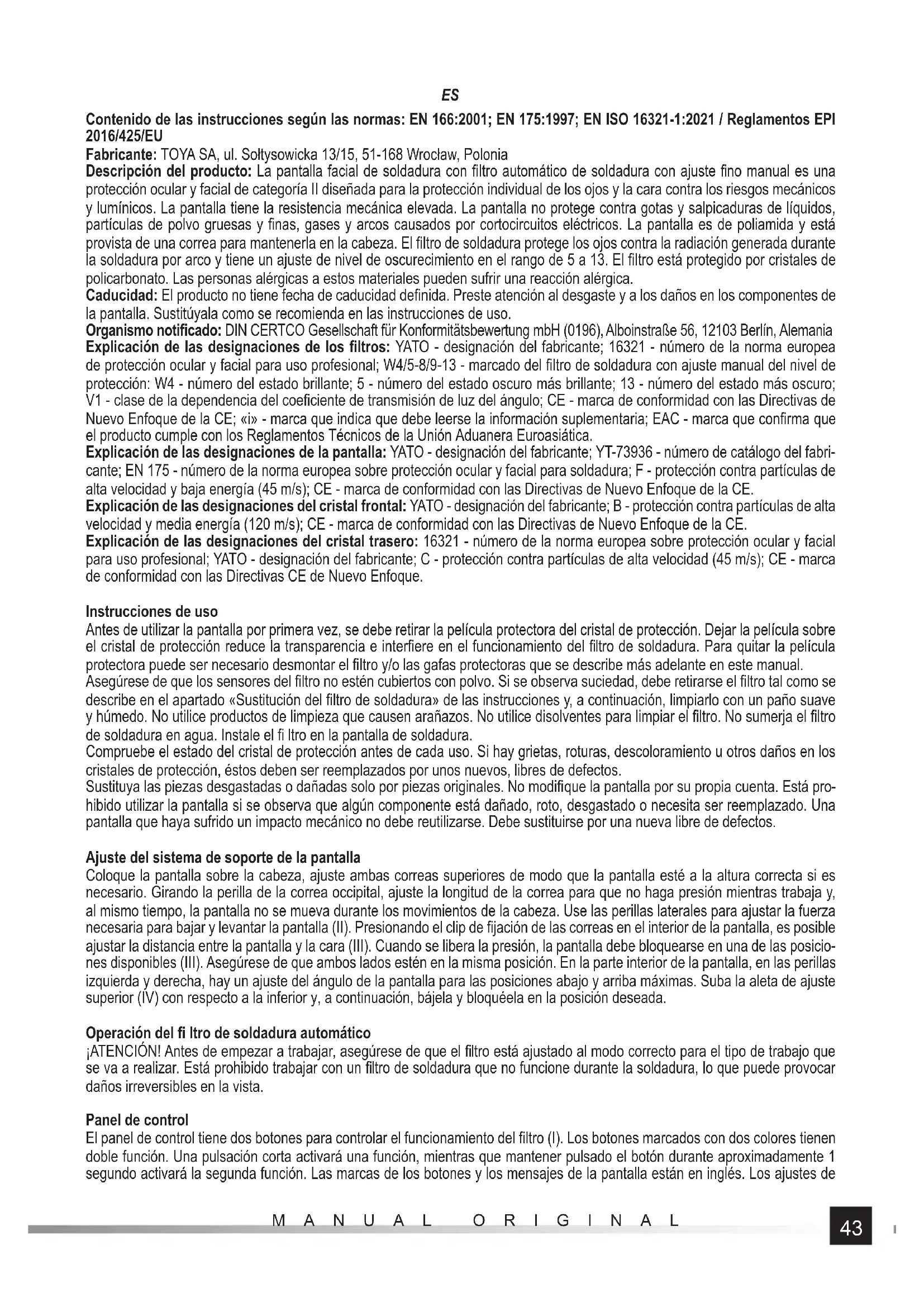 Contenido de las instrucciones según las normas: EN 166:2001; EN 175:1997; EN ISO 16321-1:2021 / Reglamentos EPI 2016/425/EU Fabricante: TOYA SA, ul. Sołtysowicka 13/15, 51-168 Wrocław, Polonia Descripción del producto: La pantalla facial de soldadura con fi ltro automático de soldadura con ajuste fi no manual es una protección ocular y facial de categoría II diseñada para la protección individual de los ojos y la cara contra los riesgos mecánicos y lumínicos. La pantalla tiene la resistencia mecánica elevada. La pantalla no protege contra gotas y salpicaduras de líquidos, partículas de polvo gruesas y fi nas, gases y arcos causados por cortocircuitos eléctricos. La pantalla es de poliamida y está provista de una correa para mantenerla en la cabeza. El fi ltro de soldadura protege los ojos contra la radiación generada durante la soldadura por arco y tiene un ajuste de nivel de oscurecimiento en el rango de 5 a 13. El fi ltro está protegido por cristales de policarbonato. Las personas alérgicas a estos materiales pueden sufrir una reacción alérgica. Caducidad: El producto no tiene fecha de caducidad defi nida. Preste atención al desgaste y a los daños en los componentes de la pantalla. Sustitúyala como se recomienda en las instrucciones de uso. Organismo notifi cado: DIN CERTCO Gesellschaft für Konformitätsbewertung mbH (0196), Alboinstraße 56, 12103 Berlín, Alemania Explicación de las designaciones de los fi ltros: YATO - designación del fabricante; 16321 - número de la norma europea de protección ocular y facial para uso profesional; W4/5-8/9-13 - marcado del fi ltro de soldadura con ajuste manual del nivel de protección: W4 - número del estado brillante; 5 - número del estado oscuro más brillante; 13 - número del estado más oscuro; V1 - clase de la dependencia del coefi ciente de transmisión de luz del ángulo; CE - marca de conformidad con las Directivas de Nuevo Enfoque de la CE; «i» - marca que indica que debe leerse la información suplementaria; EAC - marca que confi rma que el producto cumple con los Reglamentos Técnicos de la Unión Aduanera Euroasiática. Explicación de las designaciones de la pantalla: YATO - designación del fabricante; YT-73936 - número de catálogo del fabri- cante; EN 175 - número de la norma europea sobre protección ocular y facial para soldadura; F - protección contra partículas de alta velocidad y baja energía (45 m/s); CE - marca de conformidad con las Directivas de Nuevo Enfoque de la CE. Explicación de las designaciones del cristal frontal: YATO - designación del fabricante; B - protección contra partículas de alta velocidad y media energía (120 m/s); CE - marca de conformidad con las Directivas de Nuevo Enfoque de la CE. Explicación de las designaciones del cristal trasero: 16321 - número de la norma europea sobre protección ocular y facial para uso profesional; YATO - designación del fabricante; C - protección contra partículas de alta velocidad (45 m/s); CE - marca de conformidad con las Directivas CE de Nuevo Enfoque. Instrucciones de uso Antes de utilizar la pantalla por primera vez, se debe retirar la película protectora del cristal de protección. Dejar la película sobre el cristal de protección reduce la transparencia e interfi ere en el funcionamiento del fi ltro de soldadura. Para quitar la película protectora puede ser necesario desmontar el fi ltro y/o las gafas protectoras que se describe más adelante en este manual. Asegúrese de que los sensores del fi ltro no estén cubiertos con polvo. Si se observa suciedad, debe retirarse el fi ltro tal como se describe en el apartado «Sustitución del fi ltro de soldadura» de las instrucciones y, a continuación, limpiarlo con un paño suave y húmedo. No utilice productos de limpieza que causen arañazos. No utilice disolventes para limpiar el fi ltro. No sumerja el fi ltro de soldadura en agua. Instale el fi ltro en la pantalla de soldadura. Compruebe el estado del cristal de protección antes de cada uso. Si hay grietas, roturas, descoloramiento u otros daños en los cristales de protección, éstos deben ser reemplazados por unos nuevos, libres de defectos. Sustituya las piezas desgastadas o dañadas solo por piezas originales. No modifi que la pantalla por su propia cuenta. Está pro- hibido utilizar la pantalla si se observa que algún componente está dañado, roto, desgastado o necesita ser reemplazado. Una pantalla que haya sufrido un impacto mecánico no debe reutilizarse. Debe sustituirse por una nueva libre de defectos. Ajuste del sistema de soporte de la pantalla Coloque la pantalla sobre la cabeza, ajuste ambas correas superiores de modo que la pantalla esté a la altura correcta si es necesario. Girando la perilla de la correa occipital, ajuste la longitud de la correa para que no haga presión mientras trabaja y, al mismo tiempo, la pantalla no se mueva durante los movimientos de la cabeza. Use las perillas laterales para ajustar la fuerza necesaria para bajar y levantar la pantalla (II). Presionando el clip de fi jación de las correas en el interior de la pantalla, es posible ajustar la distancia entre la pantalla y la cara (III). Cuando se libera la presión, la pantalla debe bloquearse en una de las posicio- nes disponibles (III). Asegúrese de que ambos lados estén en la misma posición. En la parte interior de la pantalla, en las per illas izquierda y derecha, hay un ajuste del ángulo de la pantalla para las posiciones abajo y arriba máximas. Suba la aleta de ajuste superior (IV) con respecto a la inferior y, a continuación, bájela y bloquéela en la posición deseada. Operación del fi ltro de soldadura automático ¡ATENCIÓN! Antes de empezar a trabajar, asegúrese de que el fi ltro está ajustado al modo correcto para el tipo de trabajo que se va a realizar. Está prohibido trabajar con un fi ltro de soldadura que no funcione durante la soldadura, lo que puede provocar daños irreversibles en la vista