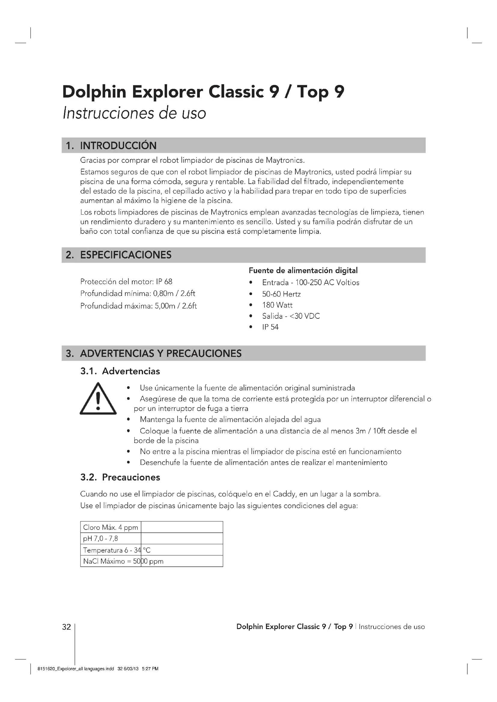- Desenchufe la fuente de alimentación antes de realizar el mantenimiento 3.2. Precauciones Cuando no use el limpiador de piscinas, colóquelo en el Caddy, en un lugar a la sombra. Use el limpiador de piscinas únicamente bajo las siguientes condiciones del agua: Cloro Máx. 4 ppmpH 7,0 - 7,8Temperatura 6 - 34 °CNaCl Máximo = 5000 ppm CAUTION Fuente de alimentación digital