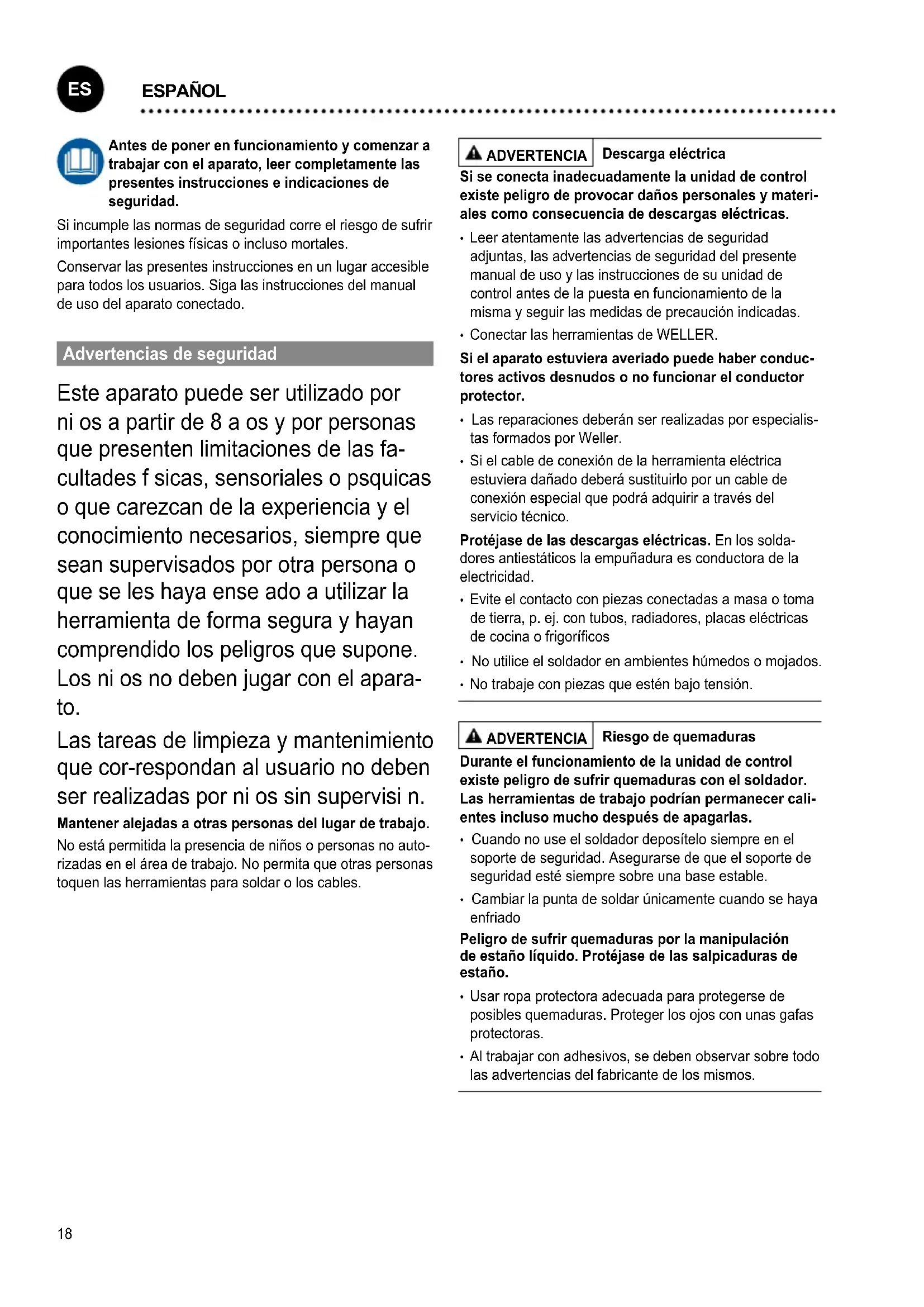 ENGLISH18 Antes de poner en funcionamiento y comenzar a trabajar con el aparato, leer completamente las presentes instrucciones e indicaciones de seguridad. Si incumple las normas de seguridad corre el riesgo de sufrir importanteslesionesfísicasoinclusomortales. Conservar las presentes instrucciones en un lugar accesible para todos los usuarios. Siga las instrucciones del manual de uso del aparato conectado. Advertencias de seguridad Este aparato puede ser utilizado por niosapartirde8aosyporpersonas que presenten limitaciones de las fa- cultades f sicas, sensoriales o psquicas oquecarezcandelaexperienciayel conocimiento necesarios, siempre que sean supervisados por otra persona o queseleshayaenseadoautilizarla herramientadeformasegurayhayan comprendido los peligros que supone. Los ni os no deben jugar con el apara- to. Lastareasdelimpiezaymantenimiento que cor-respondan al usuario no deben ser realizadas por ni os sin supervisi n. Mantener alejadas a otras personas del lugar de trabajo. Noestápermitidalapresenciadeniñosopersonasnoauto- rizadaseneláreadetrabajo.Nopermitaqueotraspersonas toquen las herramientas para soldar o los cables. ADVERTENCIA Descarga eléctrica Si se conecta inadecuadamente la unidad de control existe peligro de provocar daños personales y materi- ales como consecuencia de descargas eléctricas.