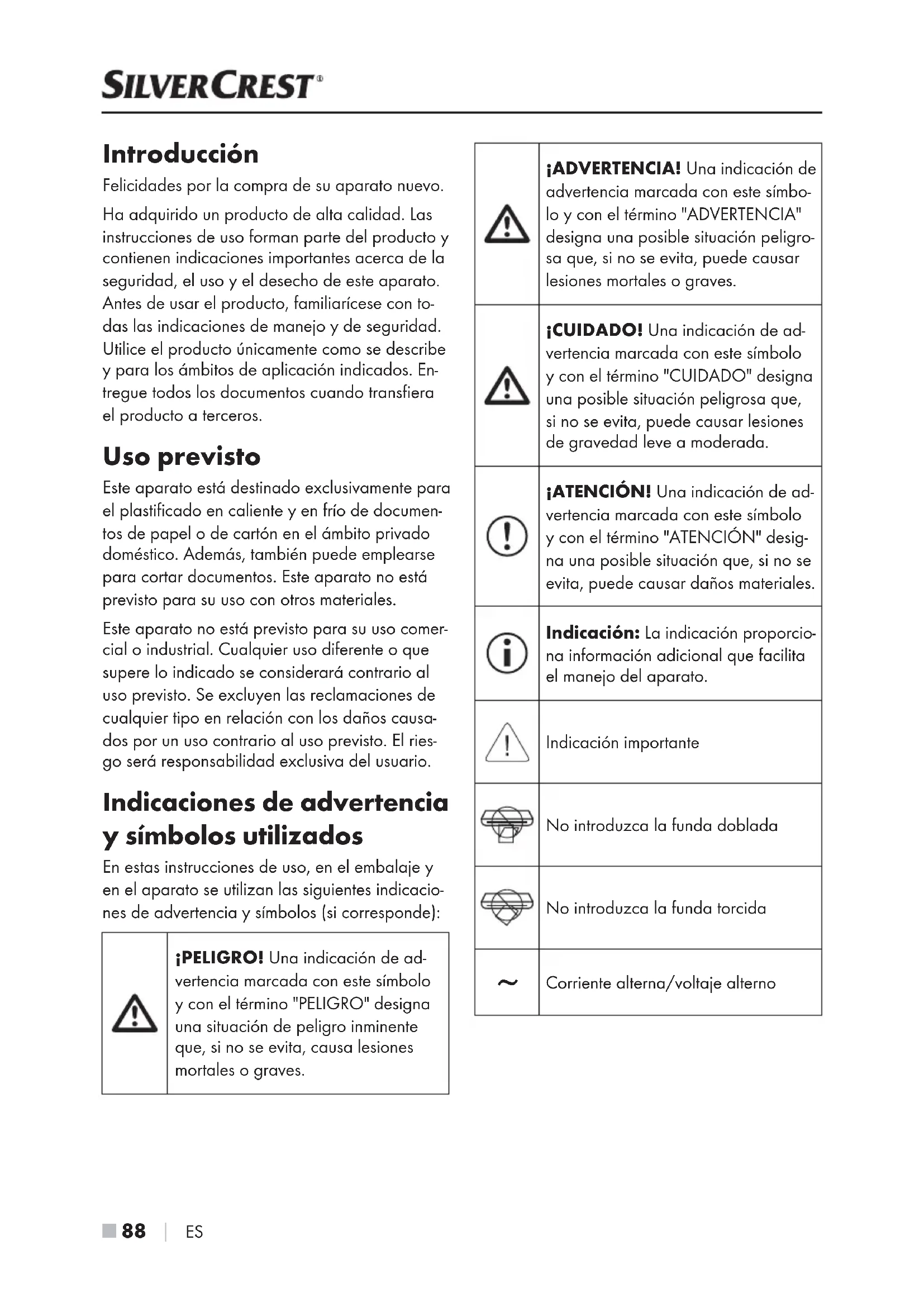 ES Introducción Felicidades por la compra de su aparato nuevo. Ha adquirido un producto de alta calidad. Las instrucciones de uso forman parte del producto y contienen indicaciones importantes acerca de la seguridad, el uso y el desecho de este aparato. Antes de usar el producto, familiarícese con to- das las indicaciones de manejo y de seguridad. Utilice el producto únicamente como se describe y para los ámbitos de aplicación indicados. En- tregue todos los documentos cuando transfiera el producto a terceros. Uso previsto Este aparato está destinado exclusivamente para el plastificado en caliente y en frío de documen- tos de papel o de cartón en el ámbito privado doméstico. Además, también puede emplearse para cortar documentos. Este aparato no está previsto para su uso con otros materiales. Este aparato no está previsto para su uso comer- cial o industrial. Cualquier uso diferente o que supere lo indicado se considerará contrario al uso previsto. Se excluyen las reclamaciones de cualquier tipo en relación con los daños causa- dos por un uso contrario al uso previsto. El ries- go será responsabilidad exclusiva del usuario. Indicaciones de advertencia y símbolos utilizados En estas instrucciones de uso, en el embalaje y en el aparato se utilizan las siguientes indicacio- nes de advertencia y símbolos (si corresponde): ¡PELIGRO! Una indicación de ad- vertencia marcada con este símbolo y con el término "PELIGRO" designa una situación de peligro inminente que, si no se evita, causa lesiones mortales o graves. ¡ADVERTENCIA! Una indicación de advertencia marcada con este símbo- lo y con el término "ADVERTENCIA" designa una posible situación peligro- sa que, si no se evita, puede causar lesiones mortales o graves. ¡CUIDADO! Una indicación de ad- vertencia marcada con este símbolo y con el término "CUIDADO" designa una posible situación peligrosa que, si no se evita, puede causar lesiones de gravedad leve a moderada. ¡ATENCIÓN! Una indicación de ad- vertencia marcada con este símbolo y con el término "ATENCIÓN" desig- na una posible situación que, si no se evita, puede causar daños materiales. Indicación: La indicación proporcio- na información adicional que facilita el manejo del aparato. Indicación importante No introduzca la funda doblada No introduzca la funda torcida