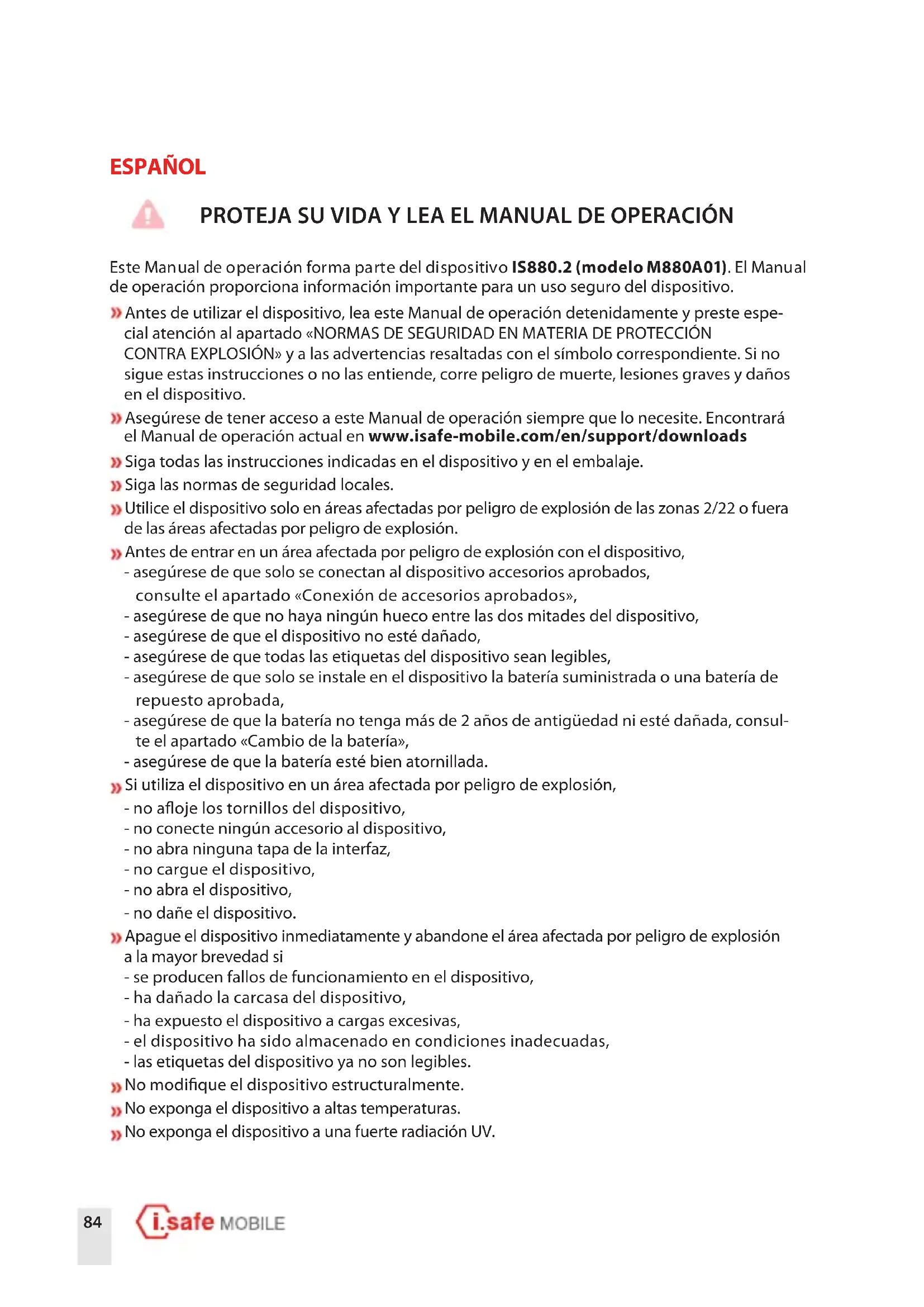 VAREMÆRKER i.safeMOBILEGmbH og i.safeMOBILEGmbH-logoet er varemærker tilhøren- de i.safeMOBILEGmbH. Leveres med Google™-appen og Google Chrome™ installeret. Google og Google Chrome er varemærker tilhørende Google LLC. Android er et varemærke tilhørende Google LLC. Alle andre varemærker og copyrights tilhører disses respektive ejere.84 ESPAÑOL PROTEJA SU VIDA Y LEA EL MANUAL DE OPERACIÓN Este Manual de operación forma parte del dispositivo IS880.2 (modelo M880A01). El Manual de operación proporciona información importante para un uso seguro del dispositivo. Antes de utilizar el dispositivo, lea este Manual de operación detenidamente y preste espe- cial atención al apartado «NORMAS DE SEGURIDAD EN MATERIA DE PROTECCIÓN CONTRA EXPLOSIÓN» y a las advertencias resaltadas con el símbolo correspondiente. Si no sigue estas instrucciones o no las entiende, corre peligro de muerte, lesiones graves y daños en el dispositivo. Asegúrese de tener acceso a este Manual de operación siempre que lo necesite. Encontrará el Manual de operación actual en www.isafe-mobile.com/en/support/downloads Siga todas las instrucciones indicadas en el dispositivo y en el embalaje. Siga las normas de seguridad locales. Utilice el dispositivo solo en áreas afectadas por peligro de explosión de las zonas 2/22 o fuera de las áreas afectadas por peligro de explosión. Antes de entrar en un área afectada por peligro de explosión con el dispositivo, - asegúrese de que solo se conectan al dispositivo accesorios aprobados, consulte el apartado «Conexión de accesorios aprobados», - asegúrese de que no haya ningún hueco entre las dos mitades del dispositivo, - asegúrese de que el dispositivo no esté dañado, - asegúrese de que todas las etiquetas del dispositivo sean legibles, - asegúrese de que solo se instale en el dispositivo la batería suministrada o una batería de repuesto aprobada, - asegúrese de que la batería no tenga más de 2 años de antigüedad ni esté dañada, consul- te el apartado «Cambio de la batería», - asegúrese de que la batería esté bien atornillada. Si utiliza el dispositivo en un área afectada por peligro de explosión, - no aoje los tornillos del dispositivo, - no conecte ningún accesorio al dispositivo, - no abra ninguna tapa de la interfaz, - no cargue el dispositivo, - no abra el dispositivo, - no dañe el dispositivo. Apague el dispositivo inmediatamente y abandone el área afectada por peligro de explosión a la mayor brevedad si - se producen fallos de funcionamiento en el dispositivo, - ha dañado la carcasa del dispositivo, - ha expuesto el dispositivo a cargas excesivas, - el dispositivo ha sido almacenado en condiciones inadecuadas, - las etiquetas del dispositivo ya no son legibles. No modique el dispositivo estructuralmente. No exponga el dispositivo a altas temperaturas. No exponga el dispositivo a una fuerte radiación UV.ES