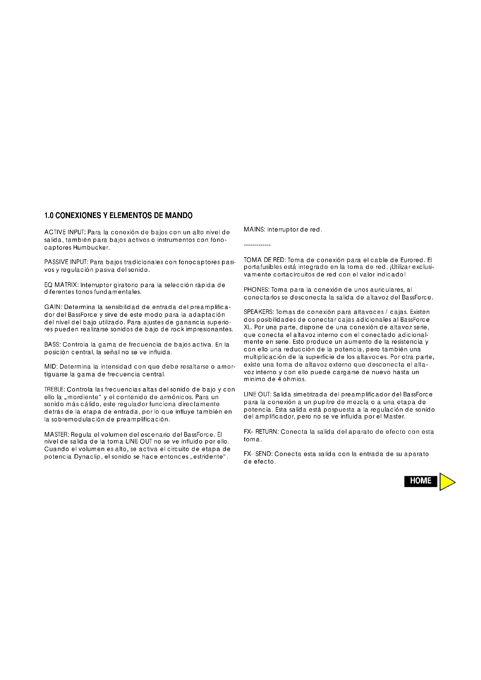 Il combo BassForce integra un woofer da 15“ ed un tweeter dinamico. Il tweeter è precisamente intonato, per consentire l‘esatta riproduzione di quegli armonici penetranti che carat- terizzano il timbro cristallino di un moderno suono di basso. Abbiamo già fissato la frequenza centrale del controllo di TREBLE, in modo che la regolazione ottenga il massimo dal tweeter. Potete inoltre attivare o disattivare il tweeter a piace- re, mediante il pulsante HF HORN ON/OFF.1.0 CONEXIONES Y ELEMENTOS DE MANDO ACTIVE INPUT: Para la conexión de bajos con un alto nivel de salida, también para bajos activos o instrumentos con fono- captores Humbucker. PASSIVE INPUT: Para bajos tradicionales con fonocaptores pasi- vos y regulación pasiva del sonido. EQ MATRIX: Interruptor giratorio para la selección rápida de diferentes tonos fundamentales. GAIN: Determina la sensibilidad de entrada del preamplifica- dor del BassForce y sirve de este modo para la adaptación del nivel del bajo utilizado. Para ajustes de ganancia superio- res pueden realizarse sonidos de bajo de rock impresionantes. BASS: Controla la gama de frecuencia de bajos activa. En la posición central, la señal no se ve influida. MID: Determina la intensidad con que debe resaltarse o amor- tiguarse la gama de frecuencia central. TREBLE: Controla las frecuencias altas del sonido de bajo y con ello la „mordiente“ y el contenido de armónicos. Para un sonido más cálido, este regulador funciona directamente detrás de la etapa de entrada, por lo que influye también en la sobremodulación de preamplificación. MASTER: Regula el volumen del escenario del BassForce. El nivel de salida de la toma LINE OUT no se ve influido por ello. Cuando el volumen es alto, se activa el circuito de etapa de potencia Dynaclip, el sonido se hace entonces „estridente“. MAINS: Interruptor de red.