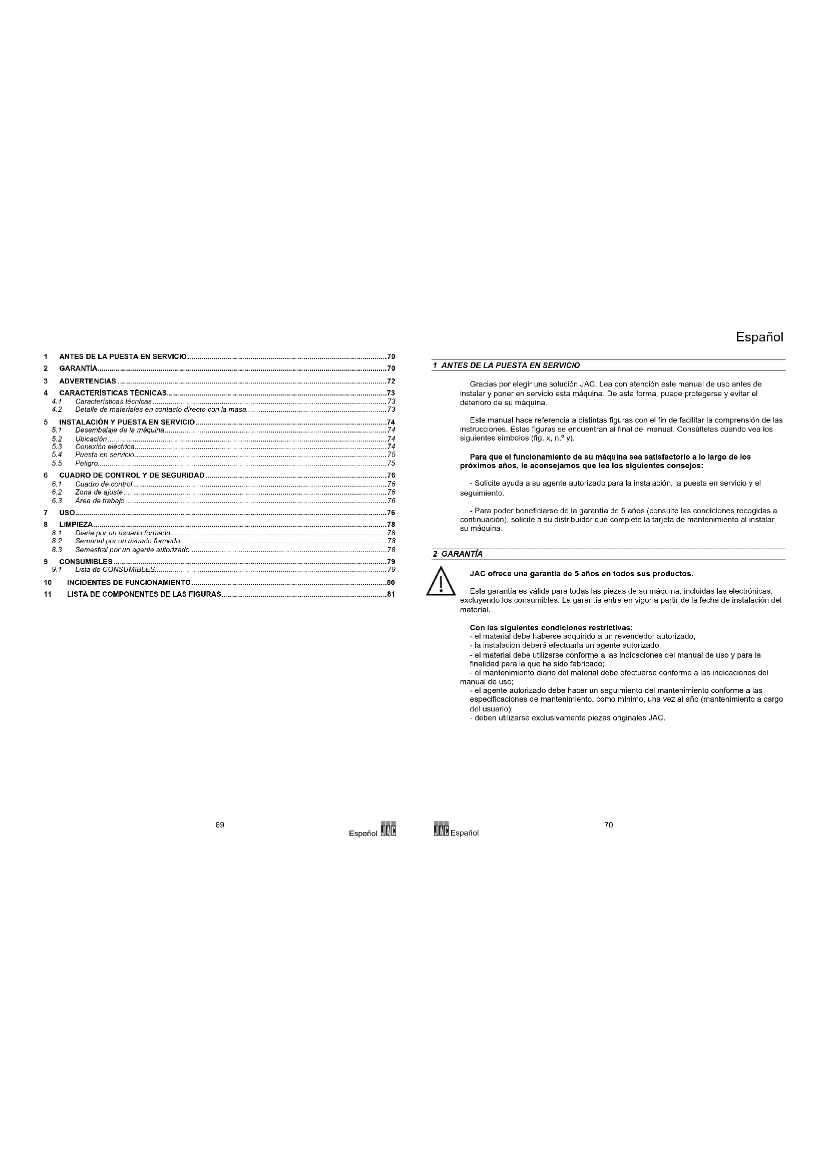 Gracias por elegir una solución JAC. Lea con atención este manual de uso antes de instalar y poner en servicio esta máquina. De esta forma, puede protegerse y evitar el deterioro de su máquina. Este manual hace referencia a distintas figuras con el fin de facilitar la comprensión de las instrucciones. Estas figuras se encuentran al final del manual. Consúltelas cuando vea los siguientes símbolos (fig. x, n.º y). Para que el funcionamiento de su máquina sea satisfactorio a lo largo de los próximos años, le aconsejamos que lea los siguientes consejos: - Solicite ayuda a su agente autorizado para la instalación, la puesta en servicio y el seguimiento. - Para poder beneficiarse de la garantía de 5 años (consulte las condiciones recogidas a continuación), solicite a su distribuidor que complete la tarjeta de mantenimiento al instalar su máquina. 2 GARANTÍA JAC ofrece una garantía de 5 años en todos sus productos. Esta garantía es válida para todas las piezas de su máquina, incluidas las electrónicas, excluyendo los consumibles. La garantía entra en vigor a partir de la fecha de instalación del material. Con las siguientes condiciones restrictivas: - el material debe haberse adquirido a un revendedor autorizado; - la instalación deberá efectuarla un agente autorizado; - el material debe utilizarse conforme a las indicaciones del manual de uso y para la finalidad para la que ha sido fabricado; - el mantenimiento diario del material debe efectuarse conforme a las indicaciones del manual de uso; - el agente autorizado debe hacer un seguimiento del mantenimiento conforme a las especificaciones de mantenimiento, como mínimo, una vez al año (mantenimiento a cargo del usuario); - deben utilizarse exclusivamente piezas originales JAC.Español