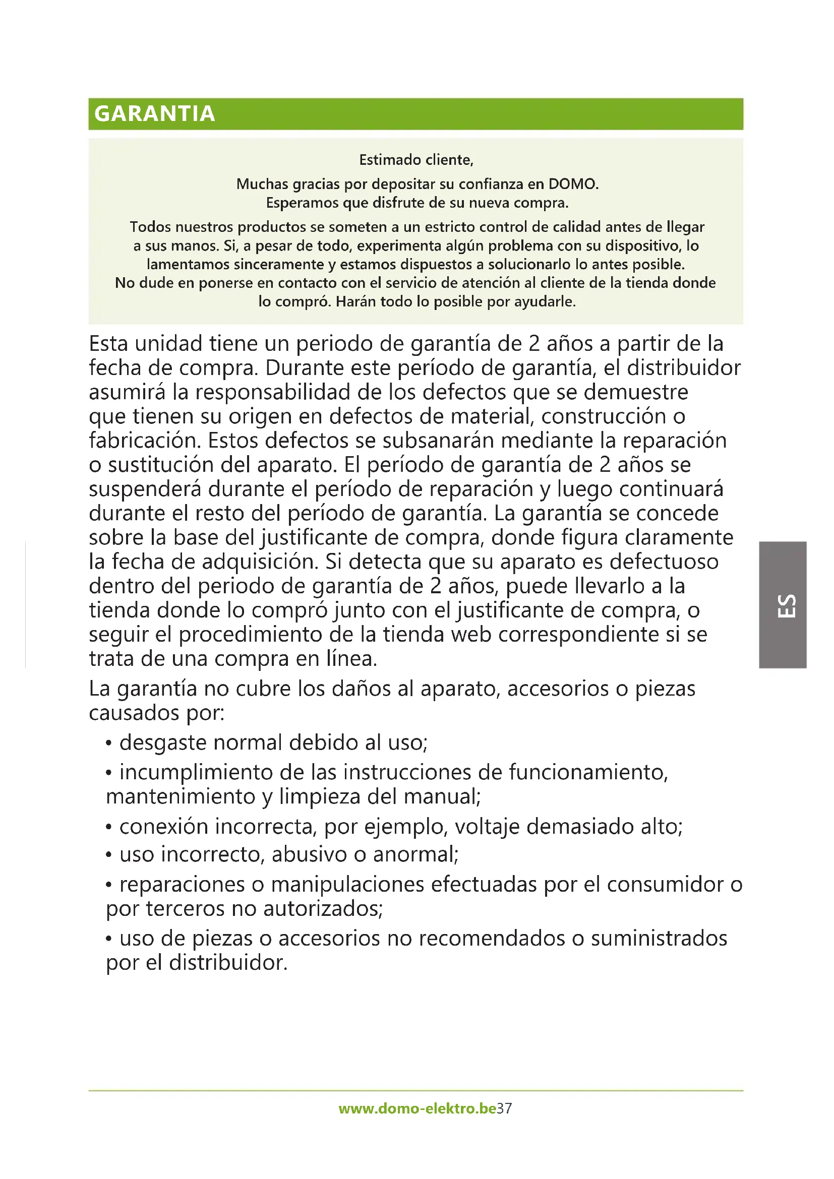 GARANTIA Estimado cliente, Muchas gracias por depositar su conanza en DOMO. Esperamos que disfrute de su nueva compra. Todos nuestros productos se someten a un estricto control de calidad antes de llegar a sus manos. Si, a pesar de todo, experimenta algún problema con su dispositivo, lo lamentamos sinceramente y estamos dispuestos a solucionarlo lo antes posible. No dude en ponerse en contacto con el servicio de atención al cliente de la tienda donde lo compró. Harán todo lo posible por ayudarle. Esta unidad tiene un periodo de garantía de 2 años a partir de la fecha de compra. Durante este período de garantía, el distribuidor asumirá la responsabilidad de los defectos que se demuestre que tienen su origen en defectos de material, construcción o fabricación. Estos defectos se subsanarán mediante la reparación o sustitución del aparato. El período de garantía de 2 años se suspenderá durante el período de reparación y luego continuará durante el resto del período de garantía. La garantía se concede sobre la base del justicante de compra, donde gura claramente la fecha de adquisición. Si detecta que su aparato es defectuoso dentro del periodo de garantía de 2 años, puede llevarlo a la tienda donde lo compró junto con el justicante de compra, o seguir el procedimiento de la tienda web correspondiente si se trata de una compra en línea. La garantía no cubre los daños al aparato, accesorios o piezas causados por: