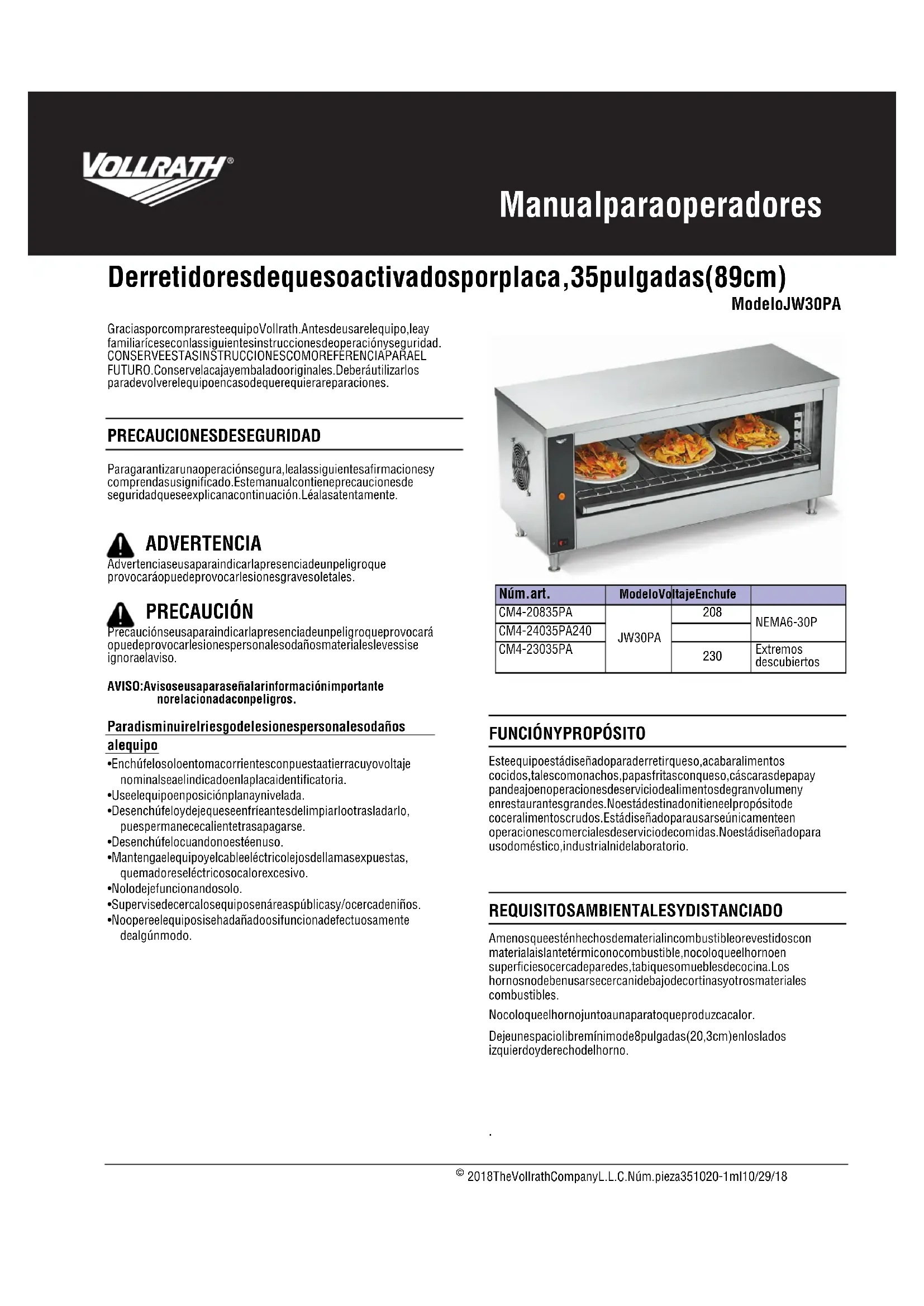 JW30PA - Horno Vollrath - Manual de uso y guía de instrucciones gratis