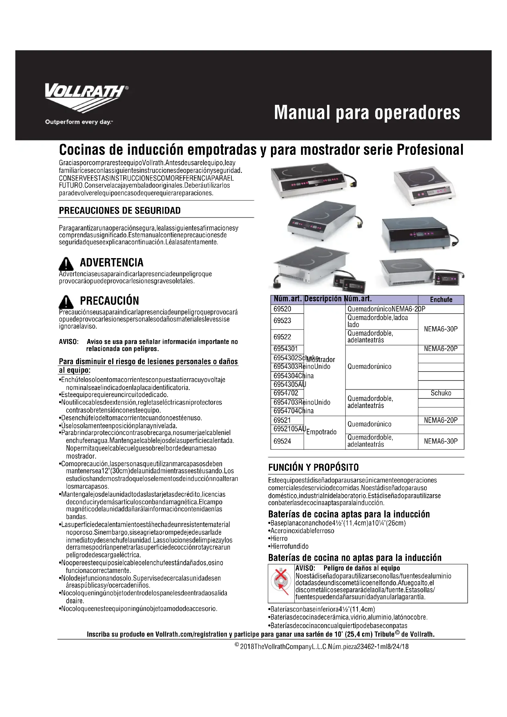 - Baterías con base inferior a 4¹⁄₂" (11,4 cm)• Baterías de cocina de cerámica, vidrio, aluminio, latón o cobre.• Baterías de cocina con cualquier tipo de base con patas ADVERTENCIA PRECAUCIÓN Núm.art. Descripción Núm.art. Enchufe69520MostradorQuemador único NEMA 6-20P69523Quemador doble, lado a lado NEMA 6-30P69522Quemador doble,adelante atrás6954301Quemador únicoNEMA 6-20P6954302 Schuko6954303 Reino Unido6954304 China6954305 AU6954702Quemador doble,adelante atrásSchuko6954703 Reino Unido6954704 China69521EmpotradoQuemador únicoNEMA 6-20P6952105 AU69524Quemador doble,adelante atrásNEMA 6-30P AVISO: Peligro de daños al equipo No está diseñado para utilizarse con ollas/fuentes de aluminiodotadas de un disco metálico en el fondo. A fuego alto, eldisco metálico se separará de la olla/fuente. Estas ollas/fuentes pueden dañar su unidad y anular la garantía.2 Cocinas de inducción empotradas y para mostrador serie Profesional Manual para operadores