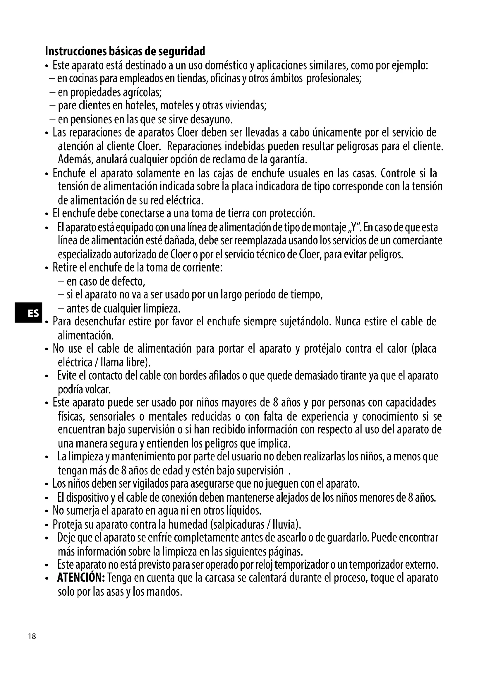 - El aparato está equipado con una línea de alimentación de tipo de montaje „Y“. En caso de que esta línea de alimentación esté dañada, debe ser reemplazada usando los servicios de un comerciante especializado autorizado de Cloer o por el servicio técnico de Cloer, para evitar peligros.