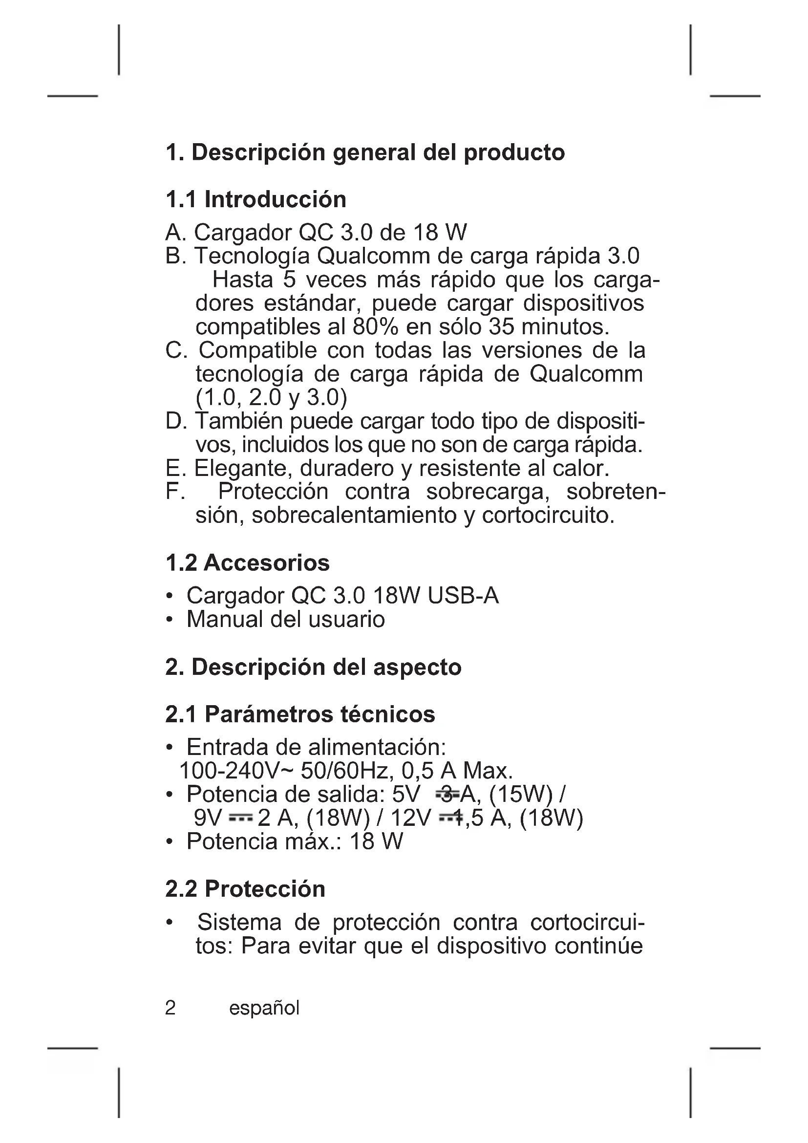 A. Cargador QC 3.0 de 18 W B. Tecnología Qualcomm de carga rápida 3.0 Hasta 5 veces más rápido que los carga- dores estándar, puede cargar dispositivos compatibles al 80% en sólo 35 minutos. C. Compatible con todas las versiones de la tecnología de carga rápida de Qualcomm (1.0, 2.0 y 3.0) D. También puede cargar todo tipo de dispositi- vos, incluidos los que no son de carga rápida. E. Elegante, duradero y resistente al calor. F. Protección contra sobrecarga, sobreten- sión, sobrecalentamiento y cortocircuito.