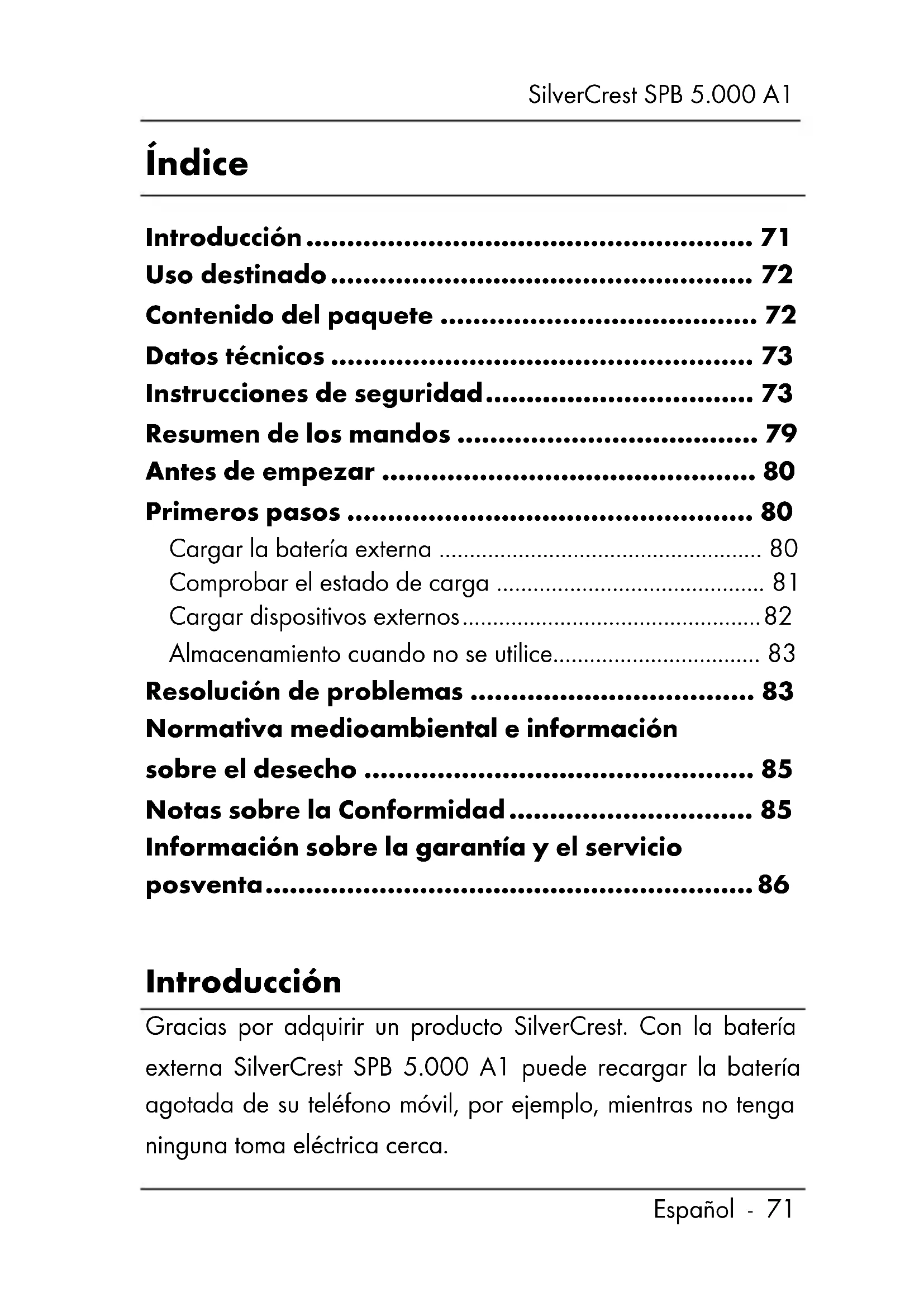 5°C a +45°C, humedad relativa máx. 75 %(sin condensar) Los datos técnicos y el diseño son susceptibles de cambios sin previo aviso. Instrucciones de seguridad Antes de utilizar la batería externa por primera vez, léase y siga las instrucciones y advertencias aunque esté familiarizadoSilverCrest SPB 5.000 A1
