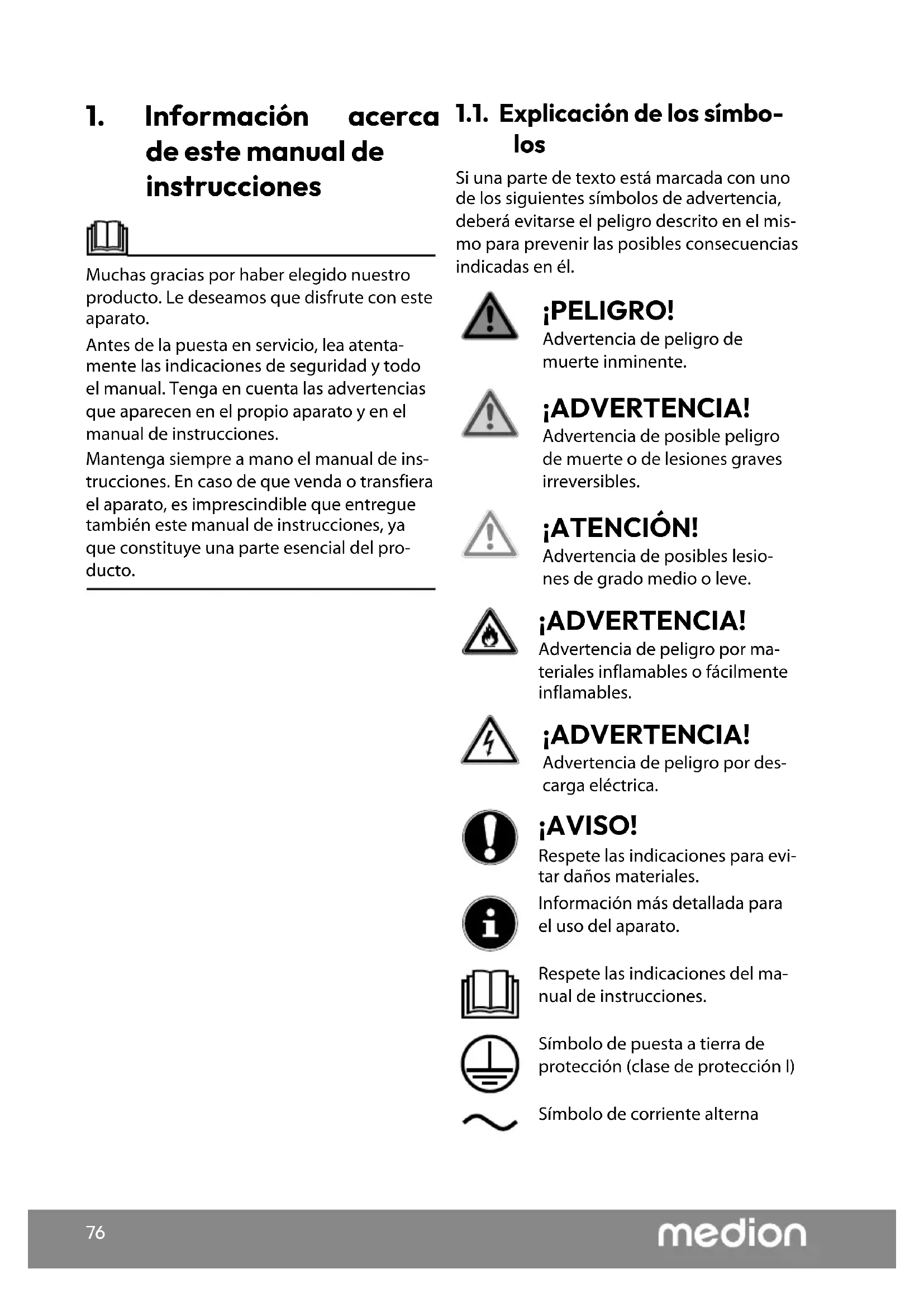 de este manual de instrucciones Muchas gracias por haber elegido nuestro producto. Le deseamos que disfrute con este aparato. Antes de la puesta en servicio, lea atenta- mente las indicaciones de seguridad y todo el manual. Tenga en cuenta las advertencias que aparecen en el propio aparato y en el manual de instrucciones. Mantenga siempre a mano el manual de ins- trucciones. En caso de que venda o transfiera el aparato, es imprescindible que entregue también este manual de instrucciones, ya que constituye una parte esencial del pro- ducto. 1.1. Explicación de los símbo- los Si una parte de texto está marcada con uno de los siguientes símbolos de advertencia, deberá evitarse el peligro descrito en el mis- mo para prevenir las posibles consecuencias indicadas en él. ¡PELIGRO! Advertencia de peligro de muerte inminente. ¡ADVERTENCIA! Advertencia de posible peligro de muerte o de lesiones graves irreversibles. ¡ATENCIÓN! Advertencia de posibles lesio- nes de grado medio o leve. ¡ADVERTENCIA! Advertencia de peligro por ma- teriales inflamables o fácilmente inflamables. ¡ADVERTENCIA! Advertencia de peligro por des- carga eléctrica. ¡AVISO! Respete las indicaciones para evi- tar daños materiales. Información más detallada para el uso del aparato. Respete las indicaciones del ma- nual de instrucciones. Símbolo de puesta a tierra de protección (clase de protección I) Símbolo de corriente alterna77