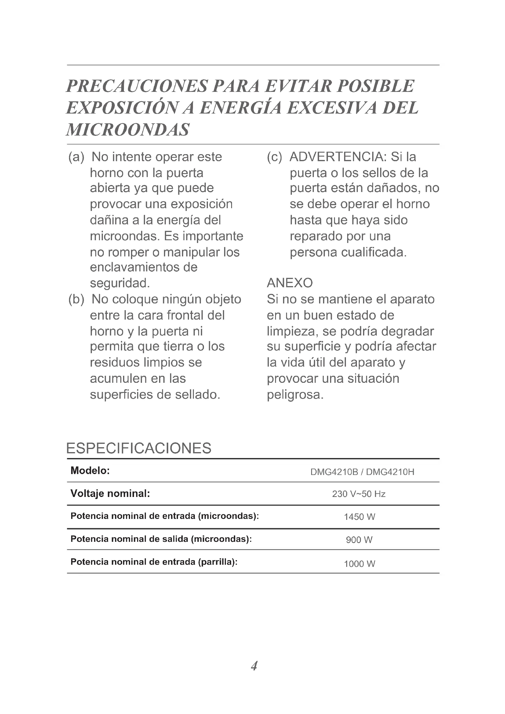 EXPOSICIÓN A ENERGÍA EXCESIVA DEL MICROONDAS (a) No intente operar este horno con la puerta abierta ya que puede provocar una exposición dañina a la energía del microondas. Es importante no romper o manipular los enclavamientos de seguridad. (b) No coloque ningún objeto entre la cara frontal del horno y la puerta ni permita que tierra o los residuos limpios se acumulen en las superficies de sellado. (c) ADVERTENCIA: Si la puerta o los sellos de la puerta están dañados, no se debe operar el horno hasta que haya sido reparado por una persona cualificada. ANEXO Si no se mantiene el aparato en un buen estado de limpieza, se podría degradar su superficie y podría afectar la vida útil del aparato y provocar una situación peligrosa. ESPECIFICACIONES 230 V~50 Hz1450 W900 W1000 W Modelo: Voltaje nominal: Potencia nominal de entrada (microondas):Potencia nominal de salida (microondas):Potencia nominal de entrada (parrilla):DMG4210B / DMG4210H5
