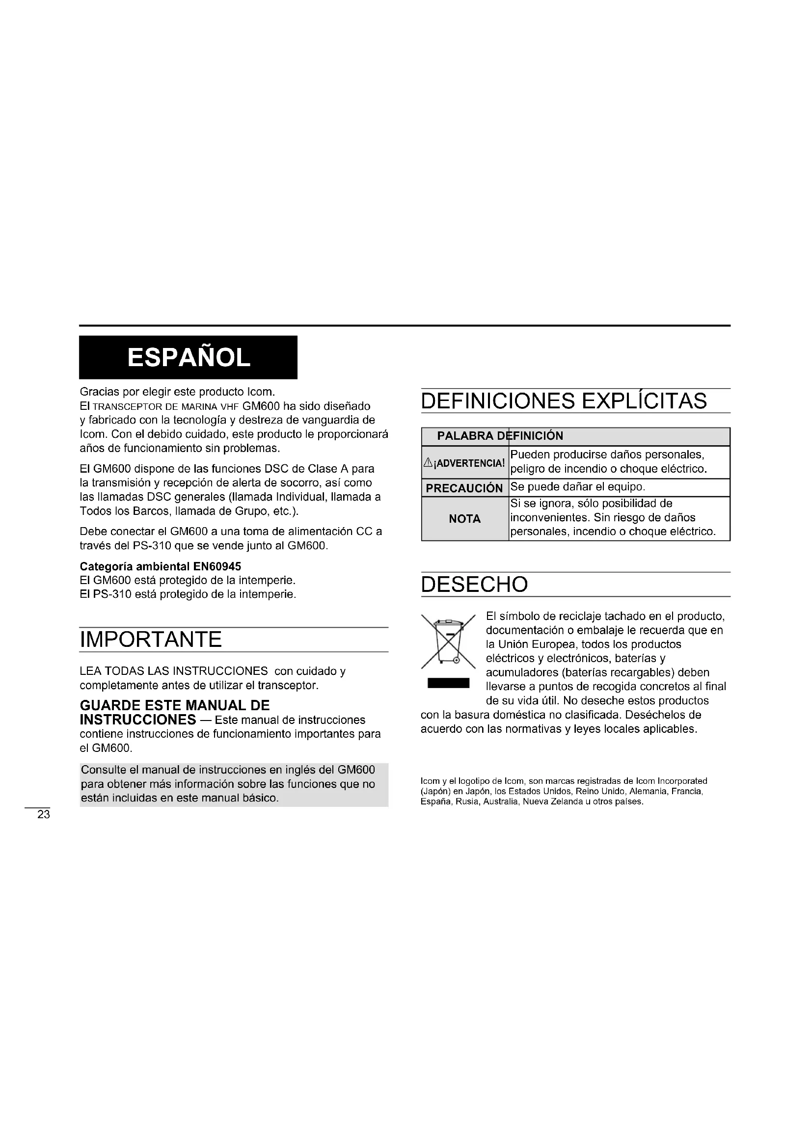 INSTRUCCIONES — Este manual de instrucciones contiene instrucciones de funcionamiento importantes para el GM600. Icom y el logotipo de Icom, son marcas registradas de Icom Incorporated (Japón) en Japón, los Estados Unidos, Reino Unido, Alemania, Francia, España, Rusia, Australia, Nueva Zelanda u otros países. Consulte el manual de instrucciones en inglés del GM600 para obtener más información sobre las funciones que no están incluidas en este manual básico.