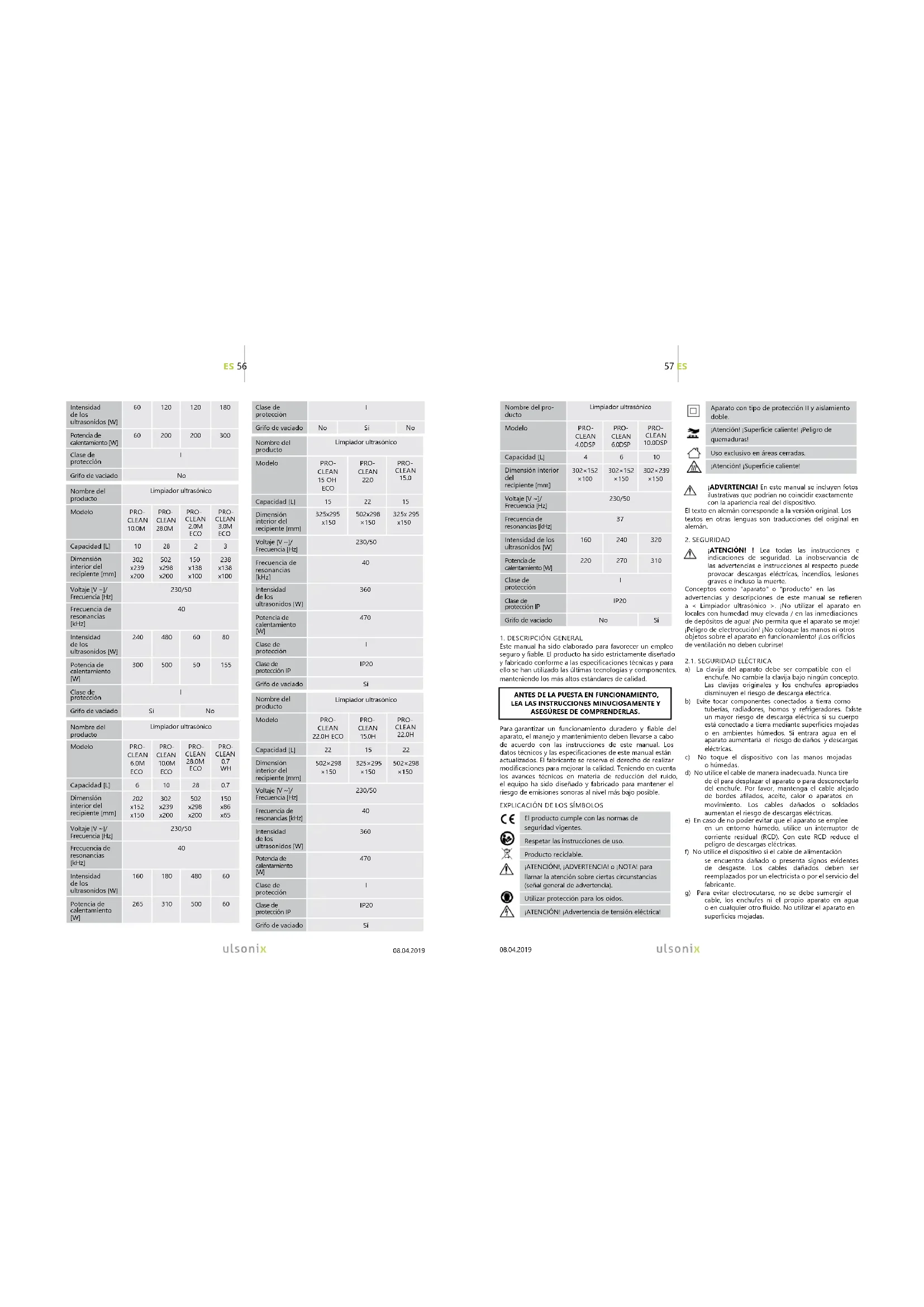 Grifo de vaciado No Ano No Nombre del producto Limpiador ultrasónico Modelo PRO- CLEAN 2.0DS PRO- CLEAN 3.0DSP PRO- CLEAN 2.0ECO PRO- CLEAN 3.0ECO Capacidad [L] 2 3 2 3 Nombre del producto Limpiador ultrasónico Modelo PRO- CLEAN 6.0ECO PRO- CLEAN 0.7M PRO- CLEAN