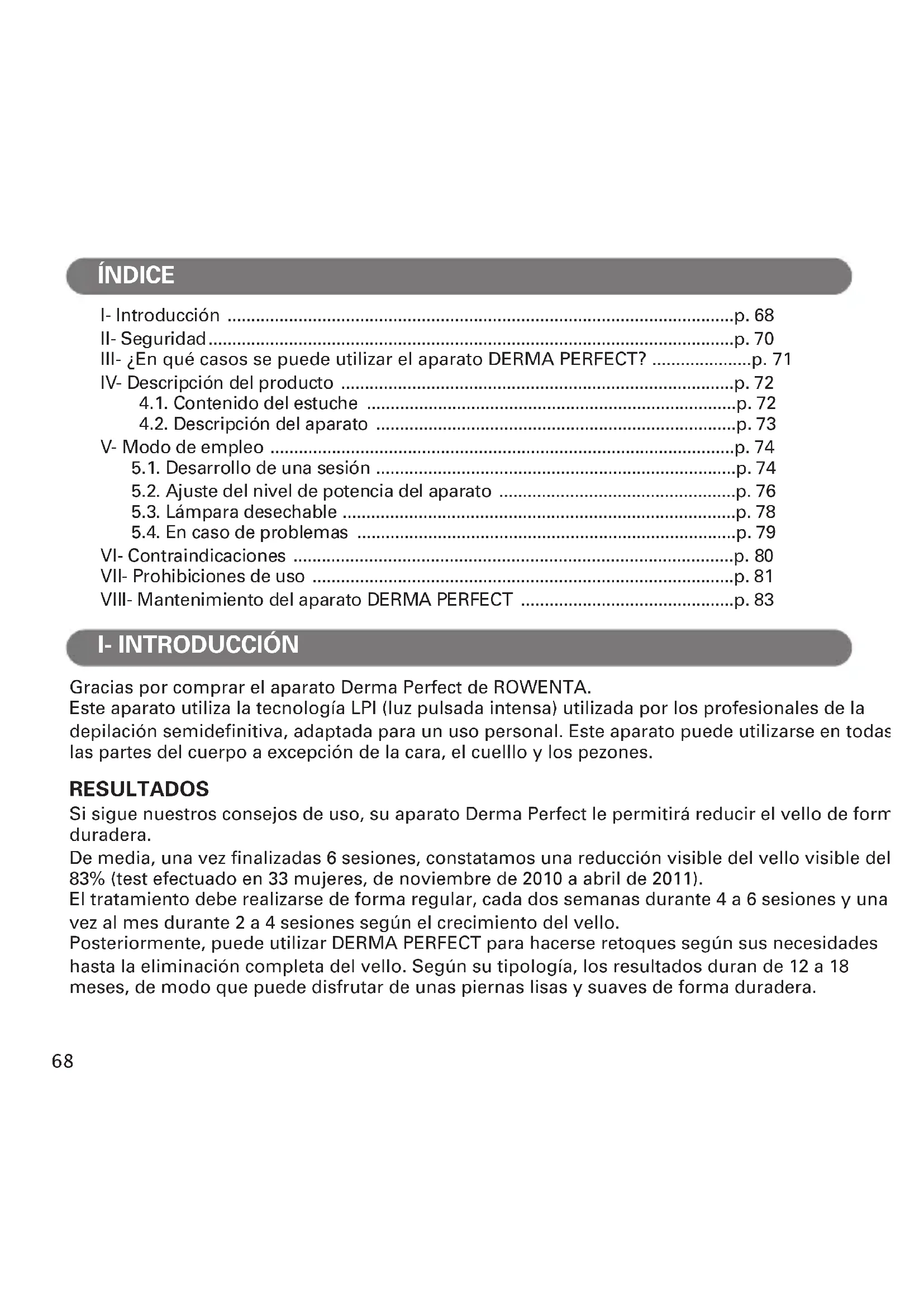 RO_EP9830_DERMA-PERFECT_1800122477_1800122477 03/02/12 15:52 Page67I- Introducción ...........................................................................................................p. 68 II- Seguridad...............................................................................................................p. 70 III- ¿En qué casos se puede utilizar el aparato DERMA PERFECT? .....................p. 71 IV- Descripción del producto ...................................................................................p. 72 4.1. Contenido del estuche ..............................................................................p. 72 4.2. Descripción del aparato ............................................................................p. 73 V- Modo de empleo ..................................................................................................p. 74 5.1. Desarrollo de una sesión ............................................................................p. 74 5.2. Ajuste del nivel de potencia del aparato ..................................................p. 76 5.3. Lámpara desechable ...................................................................................p. 78 5.4. En caso de problemas ................................................................................p. 79 VI- Contraindicaciones .............................................................................................p. 80 VII- Prohibiciones de uso .........................................................................................p. 81 VIII- Mantenimiento del aparato DERMA PERFECT .............................................p. 83 Gracias por comprar el aparato Derma Perfect de ROWENTA. Este aparato utiliza la tecnología LPI (luz pulsada intensa) utilizada por los profesionales de la depilación semidefinitiva, adaptada para un uso personal. Este aparato puede utilizarse en todas las partes del cuerpo a excepción de la cara, el cuelllo y los pezones. RESULTADOS Si sigue nuestros consejos de uso, su aparato Derma Perfect le permitirá reducir el vello de forma duradera. De media, una vez finalizadas 6 sesiones, constatamos una reducción visible del vello visible del 83% (test efectuado en 33 mujeres, de noviembre de 2010 a abril de 2011). El tratamiento debe realizarse de forma regular, cada dos semanas durante 4 a 6 sesiones y una vez al mes durante 2 a 4 sesiones según el crecimiento del vello. Posteriormente, puede utilizar DERMA PERFECT para hacerse retoques según sus necesidades hasta la eliminación completa del vello. Según su tipología, los resultados duran de 12 a 18 meses, de modo que puede disfrutar de unas piernas lisas y suaves de forma duradera. ÍNDICE