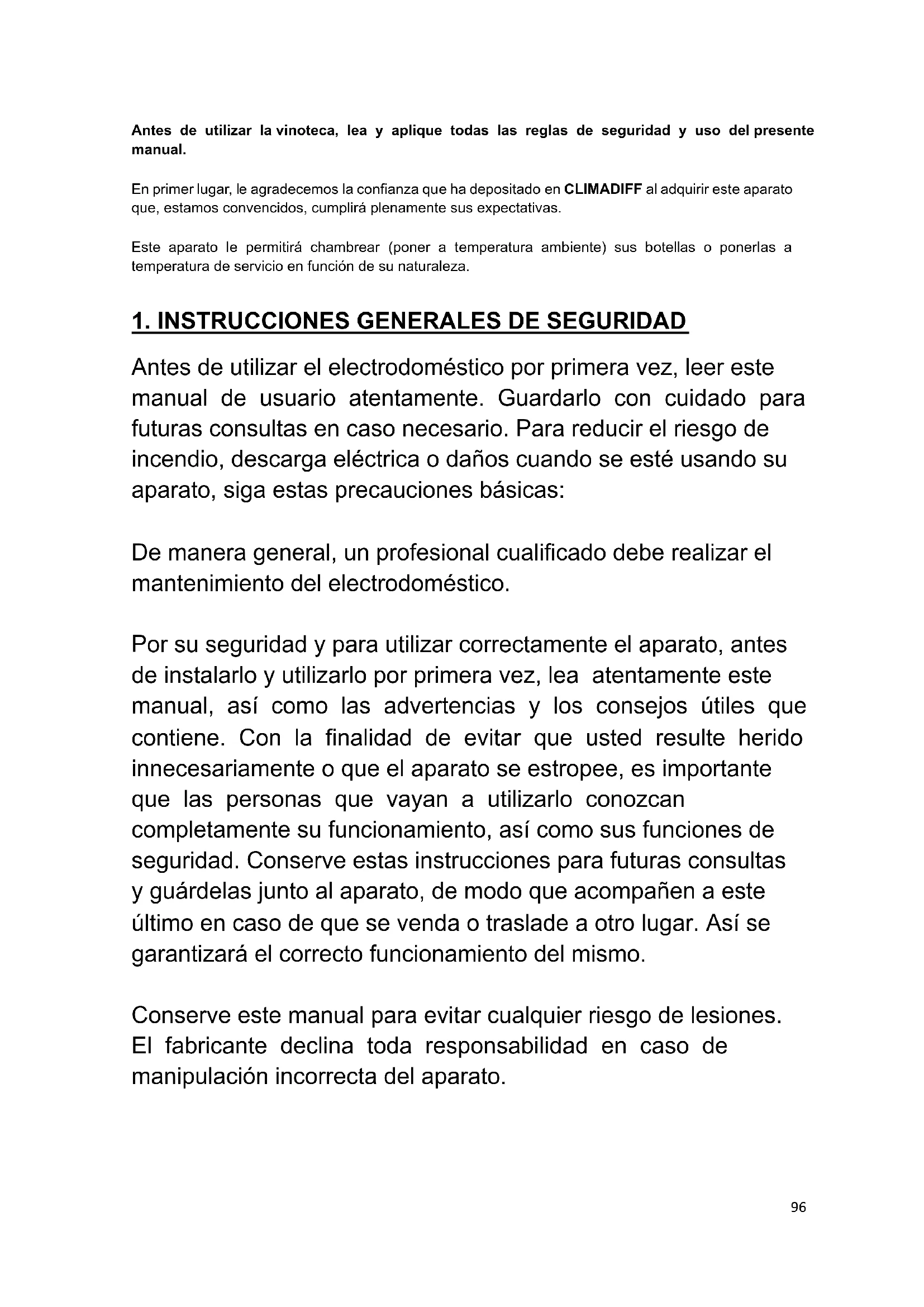 Antes de utilizar el electrodoméstico por primera vez, leer este manual de usuario atentamente. Guardarlo con cuidado para futuras consultas en caso necesario. Para reducir el riesgo de incendio, descarga eléctrica o daños cuando se esté usando su aparato, siga estas precauciones básicas: De manera general, un profesional cualificado debe realizar el mantenimiento del electrodoméstico. Por su seguridad y para utilizar correctamente el aparato, antes de instalarlo y utilizarlo por primera vez, lea atentamente este manual, así como las advertencias y los consejos útiles que contiene. Con la finalidad de evitar que usted resulte herido innecesariamente o que el aparato se estropee, es importante que las personas que vayan a utilizarlo conozcan completamente su funcionamiento, así como sus funciones de seguridad. Conserve estas instrucciones para futuras consultas y guárdelas junto al aparato, de modo que acompañen a este último en caso de que se venda o traslade a otro lugar. Así se garantizará el correcto funcionamiento del mismo. Conserve este manual para evitar cualquier riesgo de lesiones. El fabricante declina toda responsabilidad en caso de manipulación incorrecta del aparato.97 Este electrodoméstico debe utilizarse exclusivamente en el hogar para guardar bebidas especiales a una temperatura de almacenamiento superior a la del compartimento de almacenamiento para productos frescos. No está previsto bajo ningún concepto para guardar productos alimenticios frescos. Asegurarse de que la tensión de la instalación eléctrica corresponda con la placa de identificación del electrodoméstico; este último debe estar conectado a un sistema a tierra autorizado. Las reparaciones o conexiones incorrectas pueden causar riesgos para la seguridad. En caso de duda, solicitar a un profesional que compruebe la instalación eléctrica. Esta unidad debe estar correctamente conectada a la toma de corriente a tierra para su protección. No cortar ni retirar el hilo de puesta a tierra del cable de la red eléctrica suministrado. Por razones de seguridad, no utilizar un cable alargador eléctrico. Si el electrodoméstico está estropeado (p. ej., si ha recibido un golpe fuerte) o ha sufrido algún daño (subida de tensión debida a relámpagos, inundaciones o incendios), puede resultar peligroso utilizarlo. Desconectar el enchufe de la red eléctrica y solicitar a un reparador profesional autorizado que compruebe el electrodoméstico. Para impedir los peligros, no reemplace usted mismo el cable estropeado de la red eléctrica. Ponerse en contacto con el distribuidor, un centro de reparación autorizado o un reparador profesional.