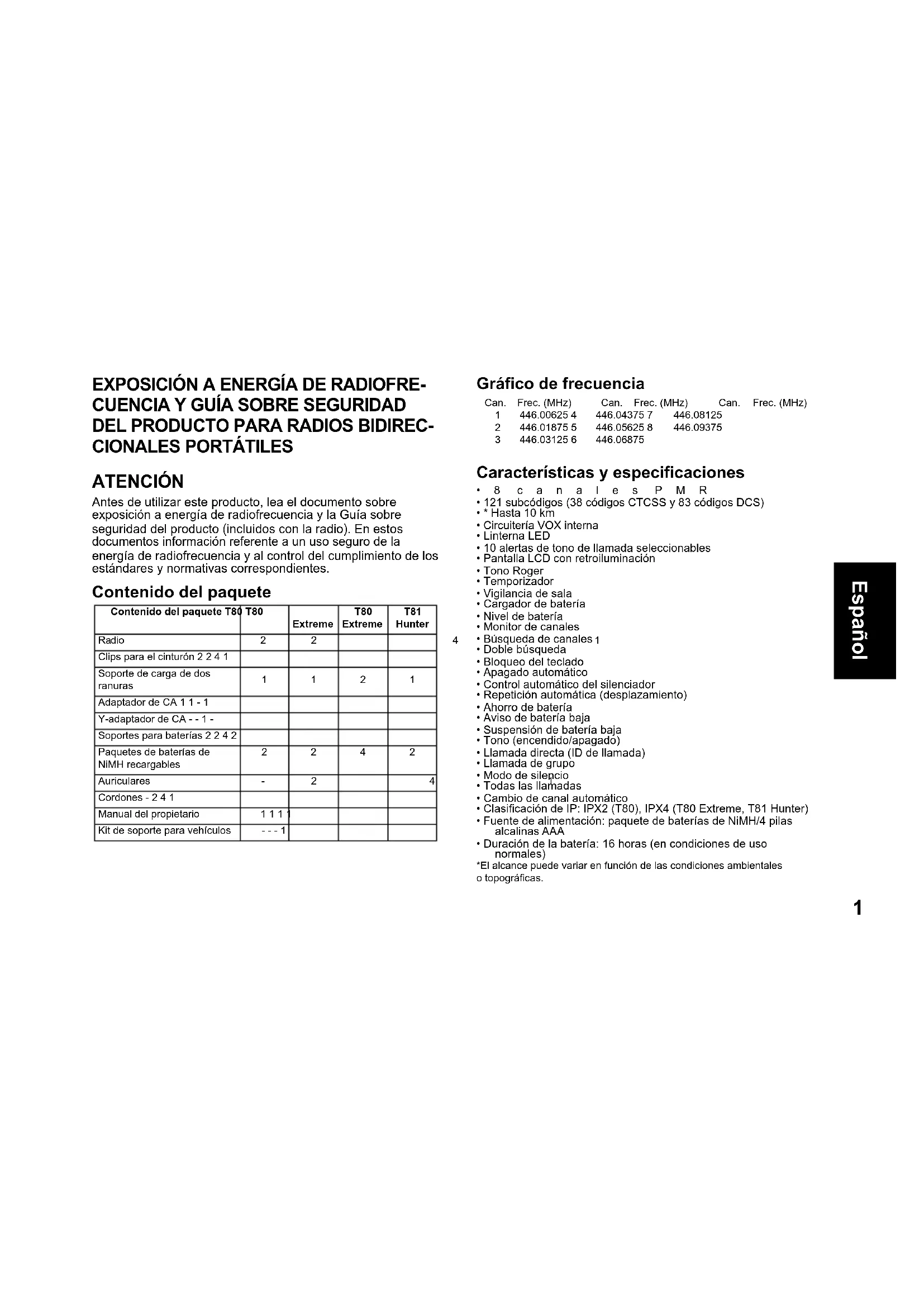 - 8 canales PMR• 121 subcódigos (38 códigos CTCSS y 83 códigos DCS)• * Hasta 10 km• Circuitería VOX interna• Linterna LED• 10 alertas de tono de llamada seleccionables• Pantalla LCD con retroiluminación• Tono Roger• Temporizador• Vigilancia de sala• Cargador de batería• Nivel de batería• Monitor de canales• Búsqueda de canales• Doble búsqueda• Bloqueo del teclado• Apagado automático • Control automático del silenciador• Repetición automática (desplazamiento)• Ahorro de batería• Aviso de batería baja• Suspensión de batería baja• Tono (encendido/apagado)• Llamada directa (ID de llamada)• Llamada de grupo• Modo de silencio• Todas las llamadas• Cambio de canal automático• Clasificación de IP: IPX2 (T80), IPX4 (T80 Extreme, T81 Hunter)• Fuente de alimentación: paquete de baterías de NiMH/4 pilas alcalinas AAA• Duración de la batería: 16 horas (en condiciones de uso normales)*El alcance puede variar en función de las condiciones ambientaleso topográficas.Contenido del paquete T80 T80 Extreme T80 Extreme T81 Hunter dio 22 4 1Clips para el cinturón 2 2 4 1Soporte de carga de dos ranuras Adaptador de CA 1 1 - 1Y-adaptador de CA - - 1 -Soportes para baterías 2 2 4 2Paquetes de baterías de NiMH recargables Auriculares 2 4 1Cordones - 2 4 1Manual del propietario 1 1 1 1Kit de soporte para vehículos - - - 1 Can. Frec. (MHz) Can. Frec. (MHz) Can. Frec. (MHz) 68015000918.book Page 1 Thursday, January 12, 2017 2:47 PMEspañol