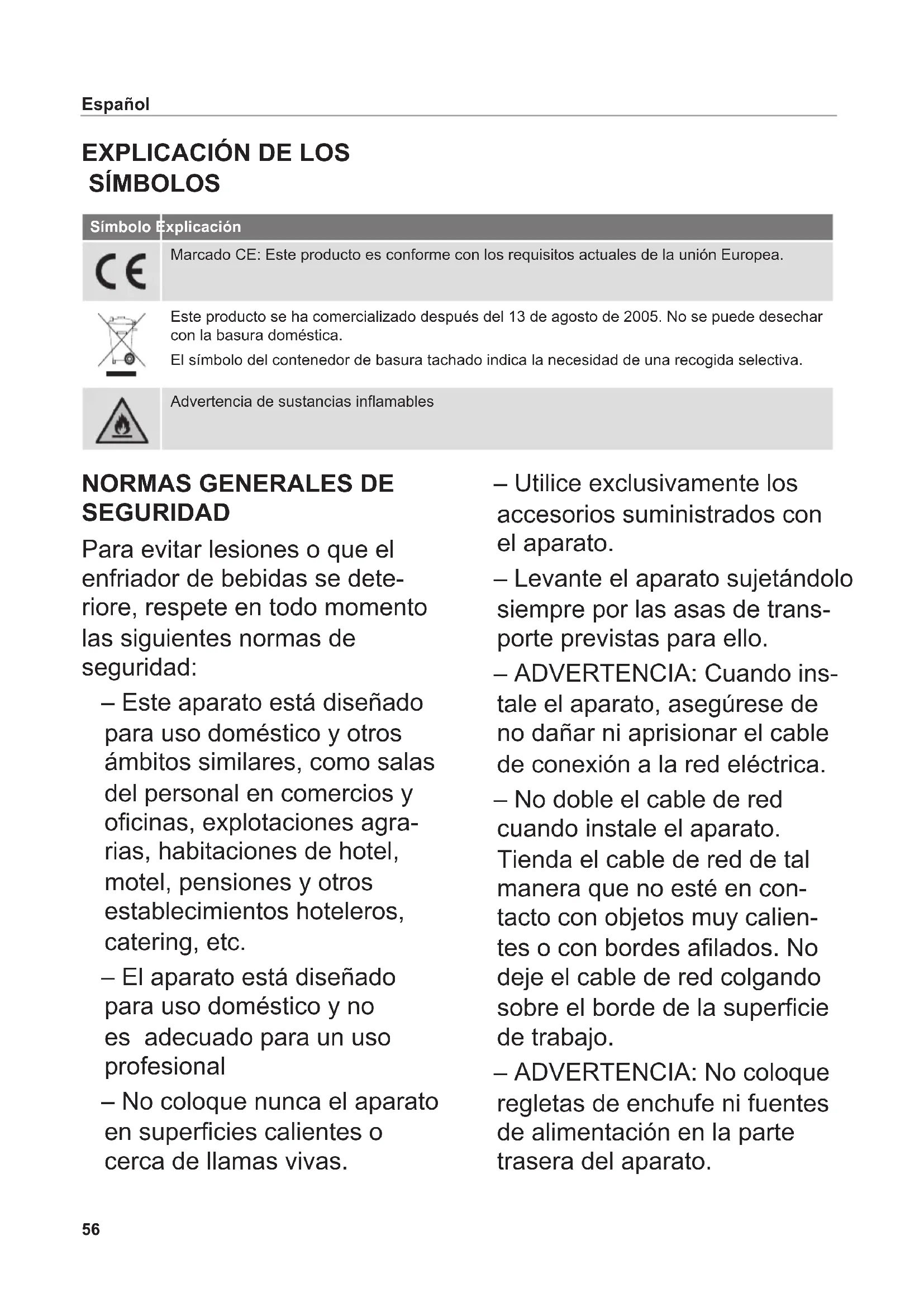 SÍMBOLOS Símbolo Explicación Marcado CE: Este producto es conforme con los requisitos actuales de la unión Europea. Este producto se ha comercializado después del 13 de agosto de 2005. No se puede desechar con la basura doméstica. El símbolo del contenedor de basura tachado indica la necesidad de una recogida selectiva. Advertencia de sustancias inamables