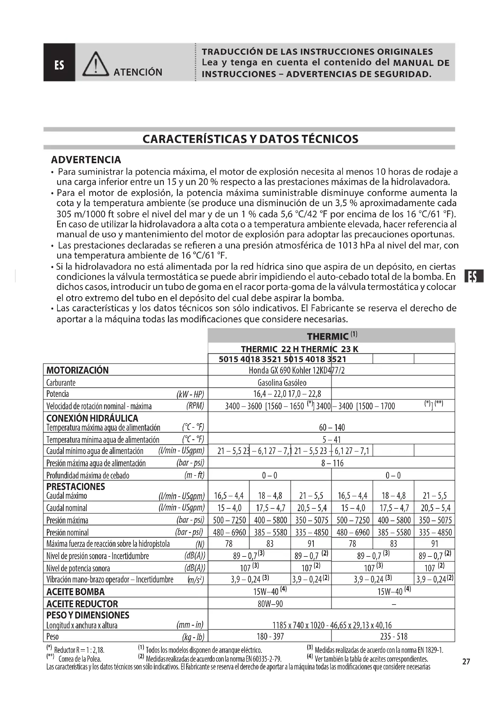 - Las prestaciones declaradas se reeren a una presión atmosférica de 1013 hPa al nivel del mar, con una temperatura ambiente de 16 °C/61 °F.