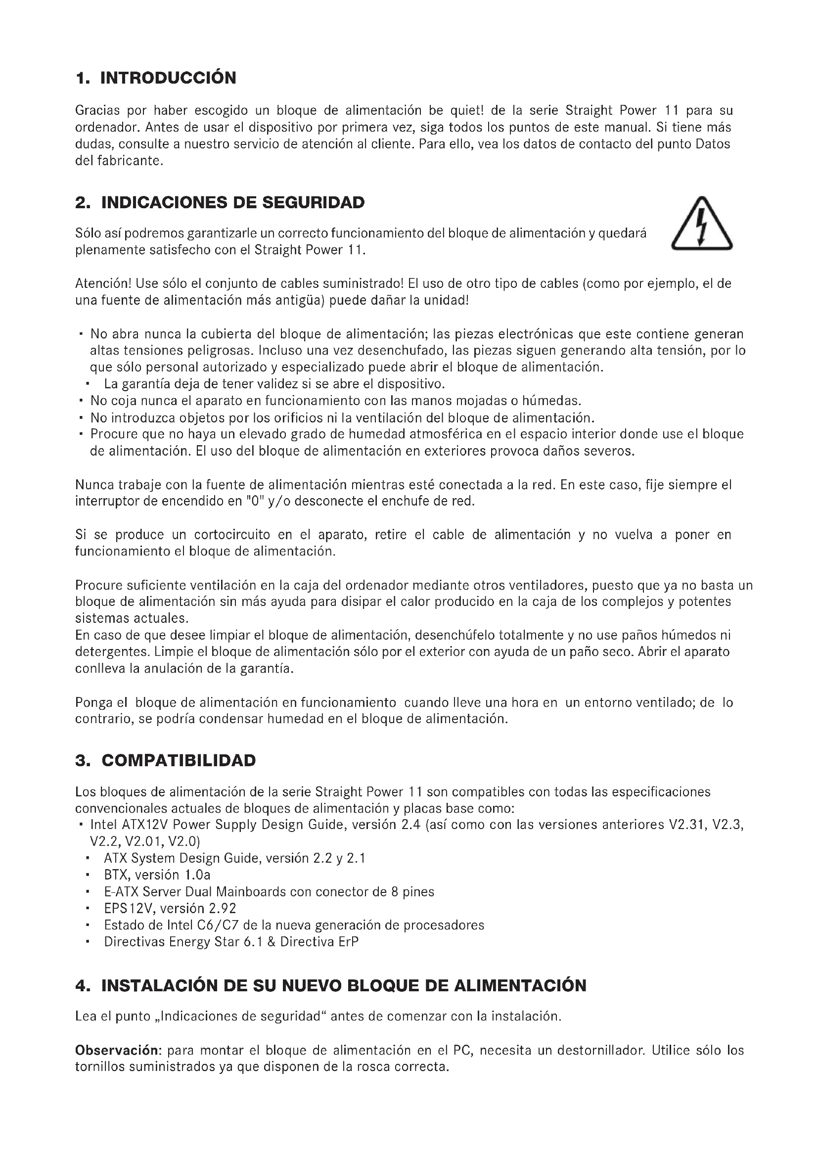 Gracias por haber escogido un bloque de alimentacion be quiet! de la series Straight Power 11 para su organador. Antes de usar el dispositivo por primera vez, siga todos los+puntos de este manual. Si tiene mas dudas, consulte a是我国的服务o de atencion al cliente. Para ello, vea los datos de contacto del punto Datos del fabricante.
