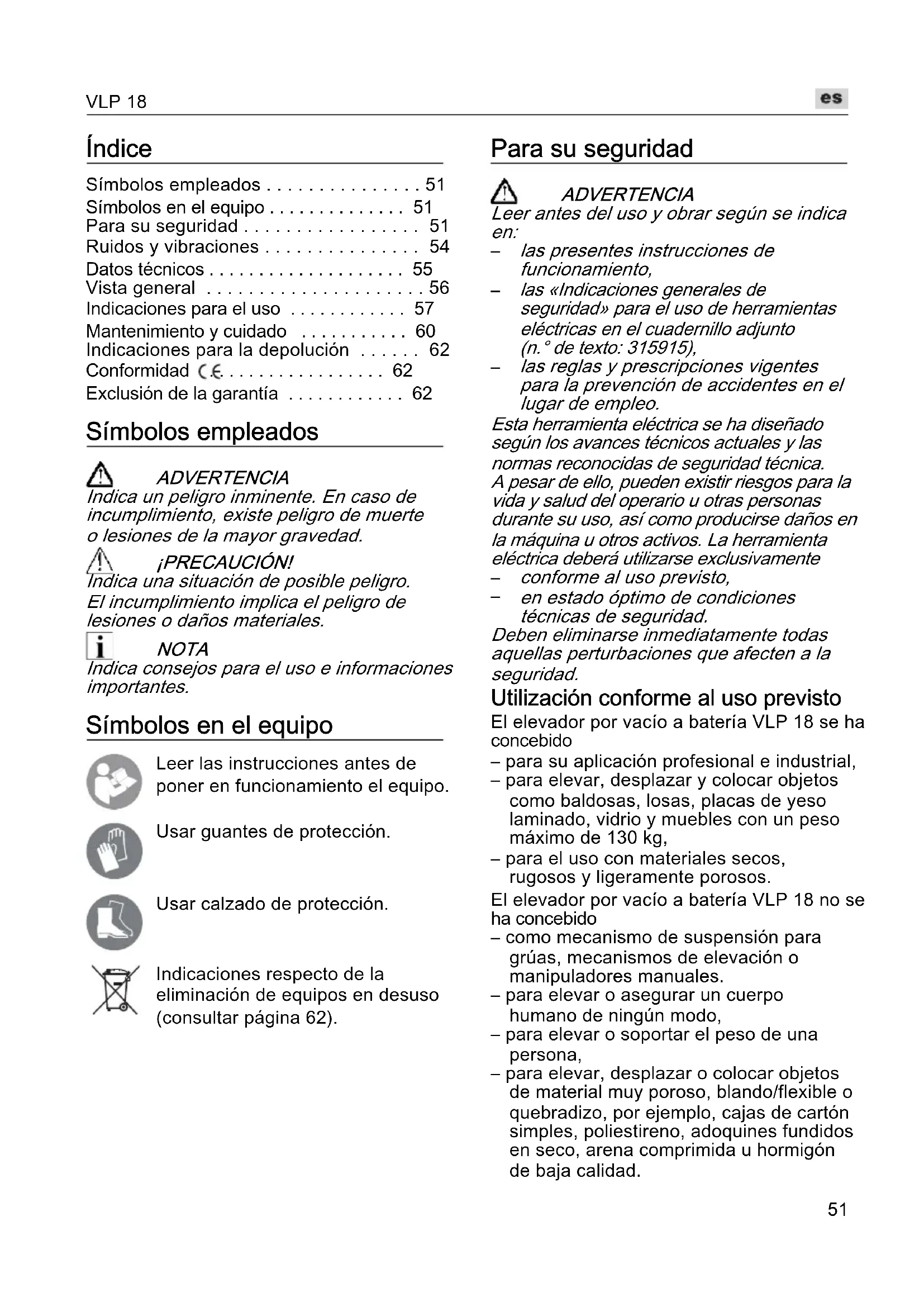 en estado óptimo de condiciones técnicas de seguridad. Deben eliminarse inmediatamente todas aquellas perturbaciones que afecten a la seguridad. Utilización conforme al uso previsto El elevador por vacío a batería VLP 18 se ha concebido – para su aplicación profesional e industrial, – para elevar, desplazar y colocar objetos como baldosas, losas, placas de yeso laminado, vidrio y muebles con un peso máximo de 130 kg, – para el uso con materiales secos, rugosos y ligeramente porosos. El elevador por vacío a batería VLP 18 no se ha concebido – como mecanismo de suspensión para grúas, mecanismos de elevación o manipuladores manuales. – para elevar o asegurar un cuerpo humano de ningún modo, – para elevar o soportar el peso de una persona, – para elevar, desplazar o colocar objetos de material muy poroso, blando/flexible o quebradizo, por ejemplo, cajas de cartón simples, poliestireno, adoquines fundidos en seco, arena comprimida u hormigón de baja calidad.VLP 18