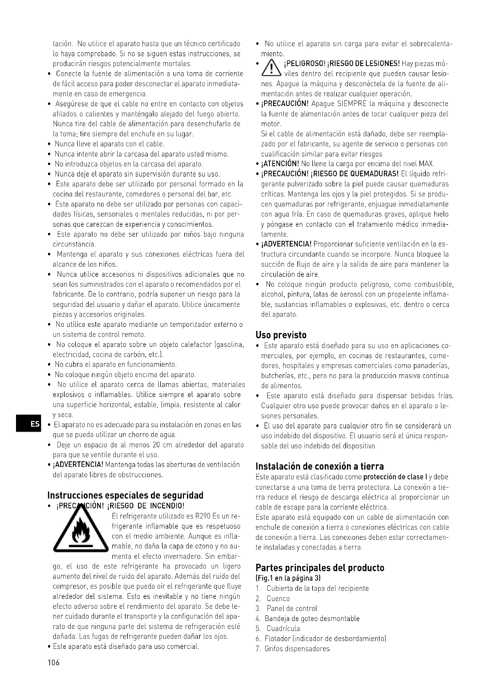 - Este aparato está diseñado para dispensar bebidas frías. Cualquier otro uso puede provocar daños en el aparato o le- siones personales.