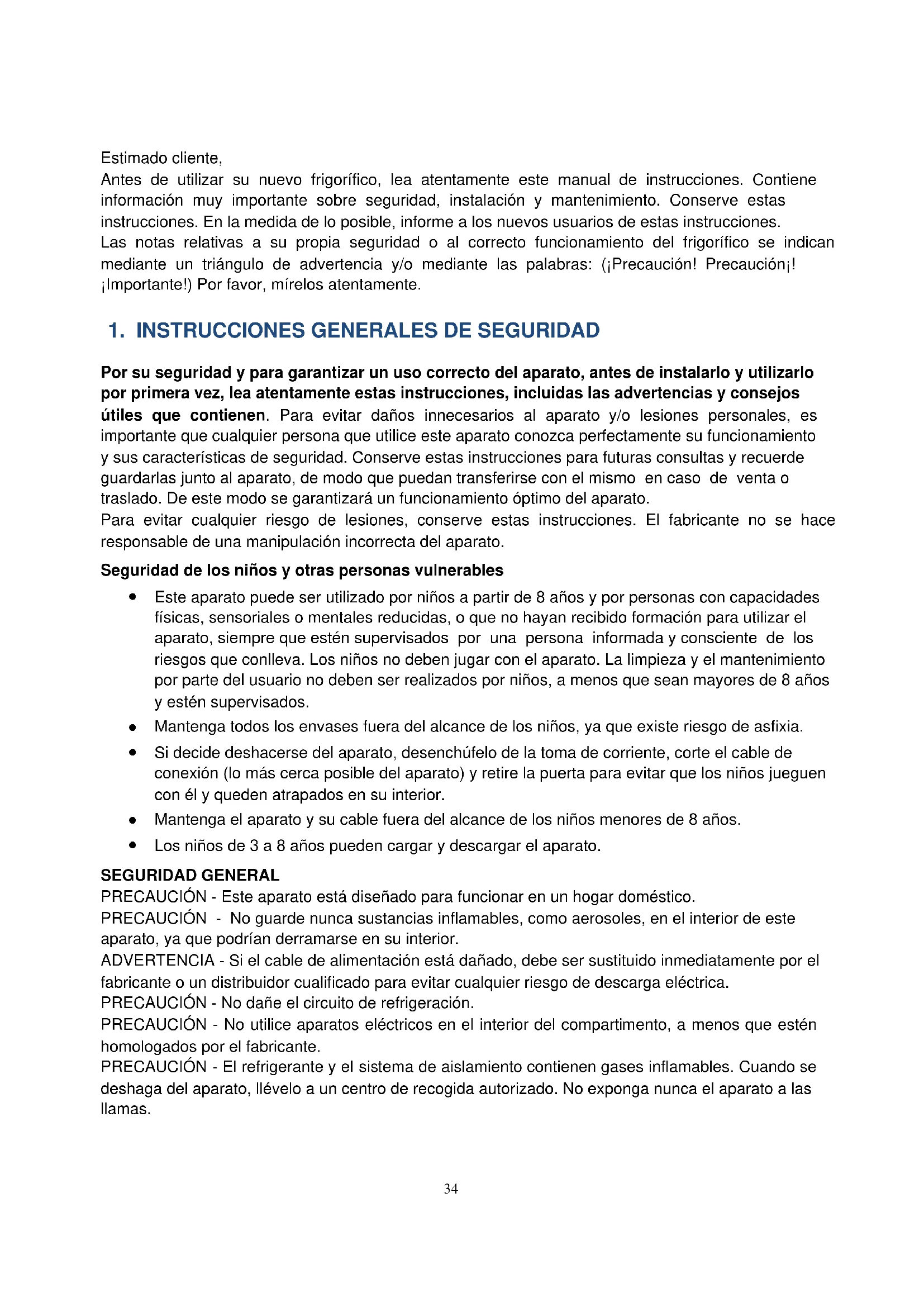Los niños de 3 a 8 años pueden cargar y descargar el aparato. SEGURIDAD GENERAL PRECAUCIÓN - Este aparato está diseñado para funcionar en un hogar doméstico. PRECAUCIÓN - No guarde nunca sustancias inflamables, como aerosoles, en el interior de este aparato, ya que podrían derramarse en su interior. ADVERTENCIA - Si el cable de alimentación está dañado, debe ser sustituido inmediatamente por el fabricante o un distribuidor cualificado para evitar cualquier riesgo de descarga eléctrica. PRECAUCIÓN - No dañe el circuito de refrigeración. PRECAUCIÓN - No utilice aparatos eléctricos en el interior del compartimento, a menos que estén homologados por el fabricante. PRECAUCIÓN - El refrigerante y el sistema de aislamiento contienen gases inflamables. Cuando se deshaga del aparato, llévelo a un centro de recogida autorizado. No exponga nunca el aparato a las llamas.35