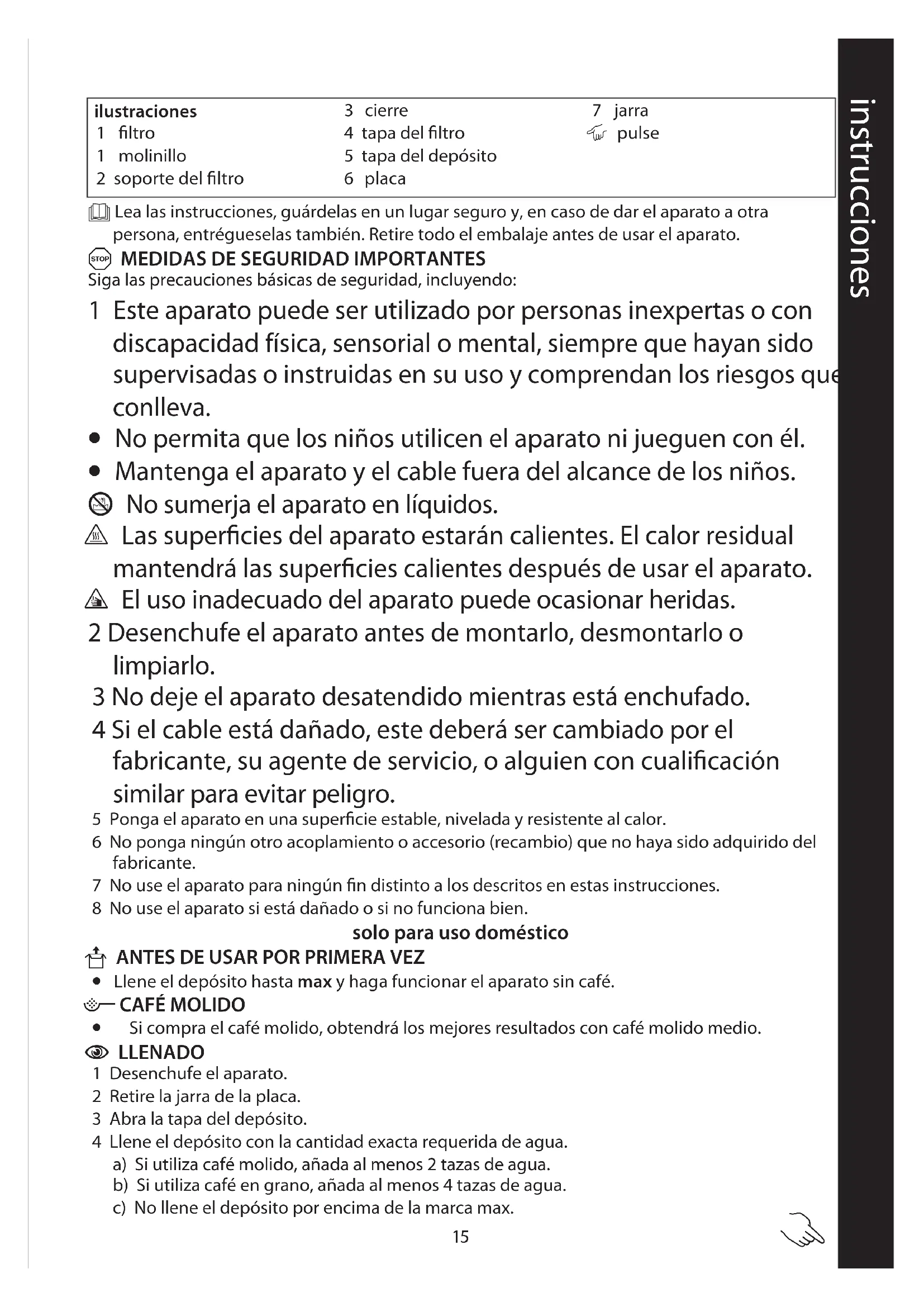 - Si compra el café molido, obtendrá los mejores resultados con café molido medio. C LLENADO 1 Desenchufe el aparato. 2 Retire la jarra de la placa. 3 Abra la tapa del depósito. 4 Llene el depósito con la cantidad exacta requerida de agua. a) Si utiliza café molido, añada al menos 2 tazas de agua. b) Si utiliza café en grano, añada al menos 4 tazas de agua. c) No llene el depósito por encima de la marca max. instrucciones ilustraciones 1 filtro 1 molinillo 2 soporte del filtro 3 cierre 4 tapa del filtro 5 tapa del depósito 6 placa 7 jarra | pulse16 5 Cierre la tapa del depósito. 6 Apriete el cierre en el extremo de la tapa del filtro y ábrala completamente. 7 Ponga la cantidad exacta de café en el filtro. a) Ponga 1 cucharada sopera rasa de café molido por cada taza. b) Ponga 1 cucharada sopera colmada de granos enteros por cada taza. c) El número de cucharadas de café debe ser el mismo que el de tazas de agua. 8 Cierre la tapa del filtro y empújela hacia abajo hasta que enganche en el cierre. C ENCENDER 9 Vuelva a colocar la jarra en la placa. 10 Enchufe el aparato a la corriente.