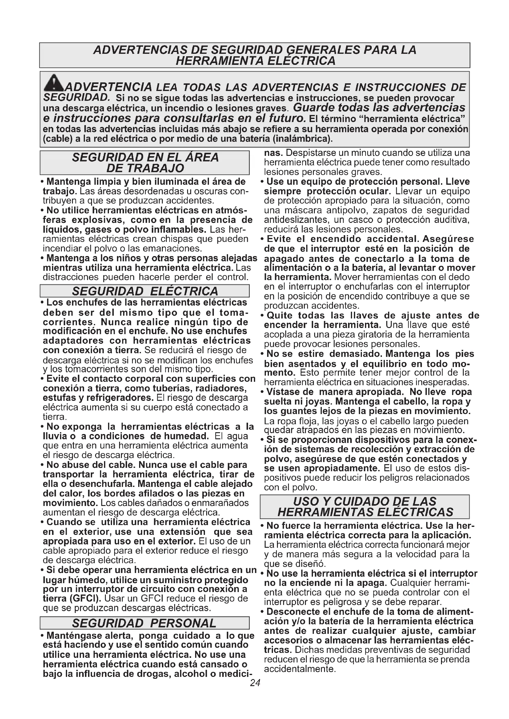 ADVERTENCIA LEA TODAS LAS ADVERTENCIAS E INSTRUCCIONES DE SEGURIDAD. Si no se sigue todas las advertencias e instrucciones, se pueden provocar una descarga eléctrica, un incendio o lesiones graves. Guarde todas las advertencias e instrucciones para consultarlas en el futuro. El término “herramienta eléctrica” en todas las advertencias incluidas más abajo se reere a su herramienta operada por conexión (cable) a la red eléctrica o por medio de una batería (inalámbrica).