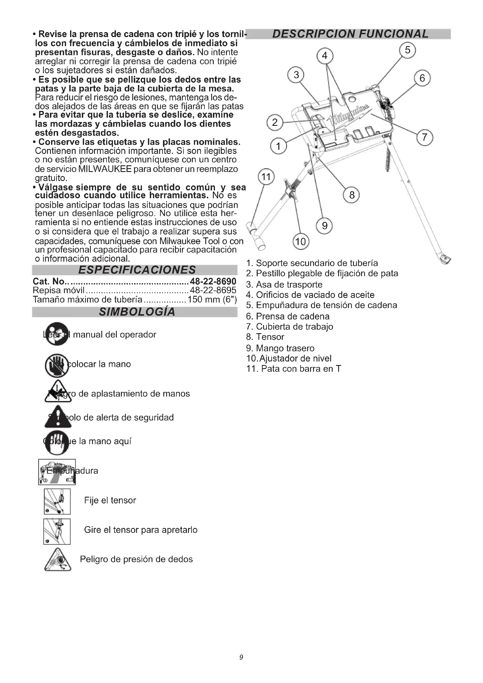 - Válgase siempre de su sentido común y sea cuidadoso cuando utilice herramientas. No es posible anticipar todas las situaciones que podrían tener un desenlace peligroso. No utilice esta her- ramienta si no entiende estas instrucciones de uso o si considera que el trabajo a realizar supera sus capacidades, comuníquese con Milwaukee Tool o con un profesional capacitado para recibir capacitación o información adicional. ESPECIFICACIONES Cat. No.. ............................................... 48-22-8690 Repisa móvil ......................................... 48-22-8695 Tamaño máximo de tubería ................. 150 mm (6") SIMBOLOGÍA Leer el manual del operador No colocar la mano Peligro de aplastamiento de manos Símbolo de alerta de seguridad Coloque la mano aquí Empuñadura