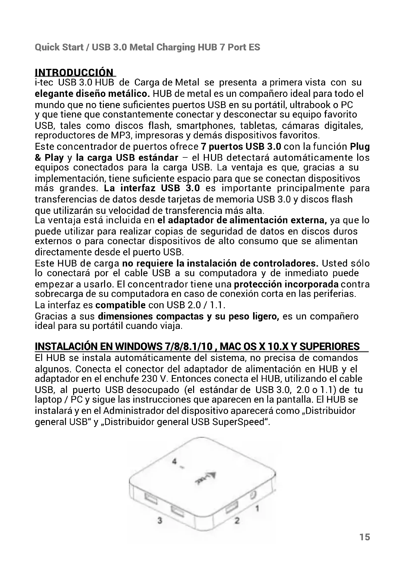 À votre disposition sur notre page web www.i-tec.cz/fr/, où se trouvent sous l’onglet de « FAQ » qui correspondent au respectif produit.15 Quick Start / USB 3.0 Metal Charging HUB 7 Port ES INTRODUCCIÓN i-tec USB 3.0 HUB de Carga de Metal se presenta a primera vista con su elegante diseño metálico. HUB de metal es un compañero ideal para todo el mundo que no tiene sucientes puertos USB en su portátil, ultrabook o PC y que tiene que constantemente conectar y desconectar su equipo favorito USB, tales como discos ash, smartphones, tabletas, cámaras digitales, reproductores de MP3, impresoras y demás dispositivos favoritos. Este concentrador de puertos ofrece 7 puertos USB 3.0 con la función Plug & Play y la carga USB estándar – el HUB detectará automáticamente los equipos conectados para la carga USB. La ventaja es que, gracias a su implementación, tiene suciente espacio para que se conectan dispositivos más grandes. La interfaz USB 3.0 es importante principalmente para transferencias de datos desde tarjetas de memoria USB 3.0 y discos ash que utilizarán su velocidad de transferencia más alta. La ventaja está incluida en el adaptador de alimentación externa, ya que lo puede utilizar para realizar copias de seguridad de datos en discos duros externos o para conectar dispositivos de alto consumo que se alimentan directamente desde el puerto USB. Este HUB de carga no requiere la instalación de controladores. Usted sólo lo conectará por el cable USB a su computadora y de inmediato puede empezar a usarlo. El concentrador tiene una protección incorporada contra sobrecarga de su computadora en caso de conexión corta en las periferias. La interfaz es compatible con USB 2.0 / 1.1. Gracias a sus dimensiones compactas y su peso ligero, es un compañero ideal para su portátil cuando viaja. INSTALACIÓN EN WINDOWS 7/8/8.1/10 , MAC OS X 10.X Y SUPERIORES El HUB se instala automáticamente del sistema, no precisa de comandos algunos. Conecta el conector del adaptador de alimentación en HUB y el adaptador en el enchufe 230 V. Entonces conecta el HUB, utilizando el cable USB, al puerto USB desocupado (el estándar de USB 3.0, 2.0 o 1.1) de tu laptop / PC y sigue las instrucciones que aparecen en la pantalla. El HUB se instalará y en el Administrador del dispositivo aparecerá como „Distribuidor general USB“ y „Distribuidor general USB SuperSpeed“.16 Quick Start / USB 3.0 Metal Charging HUB 7 PortES DESCRIPCION