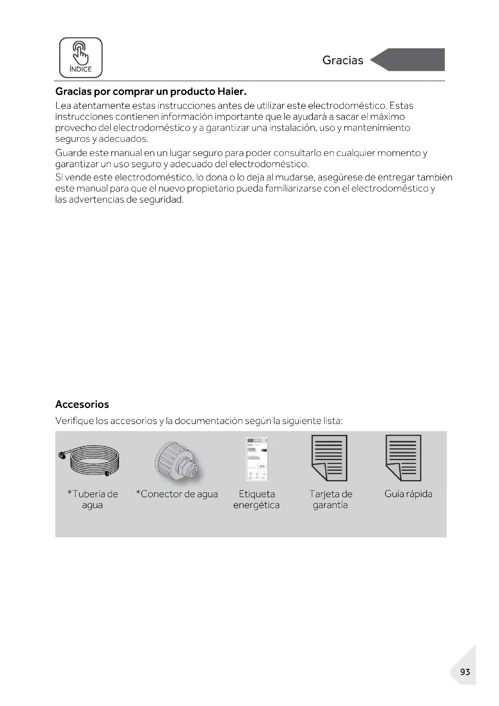 - Atención al cliente 3 Gracias ÍNDICE Gracias por comprar un producto Haier. Lea atentamente estas instrucciones antes de utilizar este electrodoméstico. Estas instrucciones contienen información importante que le ayudará a sacar el máximo provecho del electrodoméstico y a garantizar una instalación, uso y mantenimiento seguros y adecuados. Guarde este manual en un lugar seguro para poder consultarlo en cualquier momento y garantizar un uso seguro y adecuado del electrodoméstico. Si vende este electrodoméstico, lo dona o lo deja al mudarse, asegúrese de entregar también este manual para que el nuevo propietario pueda familiarizarse con el electrodoméstico y las advertencias de seguridad. Accesorios Verifique los accesorios y la documentación según la siguiente lista: *Tubería de agua *Conector de agua Etiqueta energética Tarjeta de garantía Guía rápida94 Información de seguridad ÍNDICE Información de seguridad ADVERTENCIA: Información de seguridad importante AVISO: Información general y consejos Información medioambiental Eliminación Ayude a proteger el medio ambiente y la salud humana. Tire el embalaje en los contenedores correspondientes para reciclarlo. Ayude a reciclar los residuos de aparatos eléctricos y electrónicos. No deseche los aparatos marcados con este símbolo en la basura doméstica. Lleve el producto a su planta de reciclaje local o póngase en contacto con su oficina municipal. ADVERTENCIA ¡Peligro de lesiones o asfixia! Los refrigerantes y gases deben ser eliminados de forma profesional. Asegúrese de que la tubería del circuito refrigerante no está dañada antes de desecharla adecuadamente. Desconecte el electrodoméstico de la red eléctrica. Corte el cable de red y deséchelo. Quite las bandejas y los cajones, así como el asa de la puerta y las juntas, para evitar que los niños y las mascotas se queden encerrados en el electrodoméstico.95 Información de seguridad ÍNDICE Antes de encender el electrodoméstico por primera vez, lea las siguientes directrices de seguridad: ¡ ADVERTENCIA! Antes del primer uso ► Asegúrese de que no haya daños causados por el transporte. ► Retire todo el embalaje y manténgalo fuera del alcance de los niños. ► Espere al menos dos horas antes de instalar el electrodoméstico para asegurarse de que el circuito refrigerante sea totalmente eficiente. ► Este electrodoméstico pesa mucho: manipúlelo con la ayuda de otra persona. Instalación ► Este electrodoméstico debe colocarse en un lugar bien ventilado. Asegúrese de dejar un espacio libre de al menos 10 cm por encima y alrededor del electrodoméstico. ► No coloque el electrodoméstico en un área húmeda o en un lugar donde pueda recibir salpicaduras de agua. Limpie y seque las salpicaduras y manchas con un paño suave y limpio. ► No instale el electrodoméstico bajo la luz directa del sol o cerca de fuentes de calor (p. ej.: fogones, estufas ). ► Instale y nivele el electrodoméstico en un lugar adecuado para su tamaño y uso. ► Mantenga libres de obstrucciones los orificios de ventilación del electrodoméstico o de la estructura en la que esté colocado. ► Asegúrese de que la información eléctrica de la placa de características técnicas coincida con la fuente de alimentación. Si no es así, póngase en contacto con un electricista. ► Este electrodoméstico funciona mediante una fuente de alimentación de 220-240 V CA/50 Hz. Una fluctuación anormal del voltaje puede provocar que el electrodoméstico no se ponga en marcha o que se dañe el control de temperatura o el compresor, o que se oiga un ruido anormal durante el funcionamiento. En tal caso, se deberá instalar un regulador automático. ► No utilice adaptadores de múltiples contactos ni cables de extensión. ► No ubique tomas de corriente múltiples portátiles ni fuentes de alimentación portátiles en la parte trasera del electrodoméstico. ► Asegúrese de que el cable de alimentación no quede aprisionado por el frigorífico. No oprima el cable de alimentación.96 Información de seguridad ÍNDICE ¡ADVERTENCIA! ► Utilice una toma de corriente independiente puesta a tierra como fuente de alimen- tación, que sea de fácil acceso. Este electrodoméstico debe conectarse a tierra. Solo para el Reino Unido: El cable de alimentación de este electrodoméstico está equipado con un enchufe de 3 cables (con puesta a tierra) que se ajusta a una toma de corriente estándar de 3 cables (puesta a tierra). No corte ni desmonte la tercera patilla (toma de tierra). Una vez instalado el electrodoméstico, el enchufe debe ser accesible. ► No dañe el circuito del refrigerante. Uso diario ► Este electrodoméstico puede ser utilizado por niños a partir de 8 años y por personas con capacidades físicas, sensoriales o mentales reducidas, o sin experiencia o cono- cimientos previos, siempre y cuando hayan recibido la supervisión y las instrucciones necesarias para utilizar el electrodoméstico de forma segura y comprendan los riesgos que implica. ► Se permite que los niños de 3 a 8 años llenen y vacíen electrodomésticos de refri- geración, pero no están autorizados a limpiarlos o instalarlos. ► Mantenga alejados del electrodoméstico a los niños menores de 3 años a menos que estén constantemente supervisados. ► Los niños no deben jugar con este electrodoméstico. ► Si hay una fuga de un gas inflamable en las proximidades del electrodoméstico, cierre la válvula de gas que presente la fuga, abra las puertas y ventanas y no desconecte ni conecte el cable de alimentación del frigorífico o de cualquier otro electrodoméstico. ► Tenga en cuenta que el electrodoméstico está configurado para funcionar en un intervalo de temperatura ambiente específico de entre 10 y 38 °C. El electro- doméstico no puede funcionar correctamente si se deja durante mucho tiempo a una temperatura superior o inferior al intervalo indicado. ► No coloque artículos i