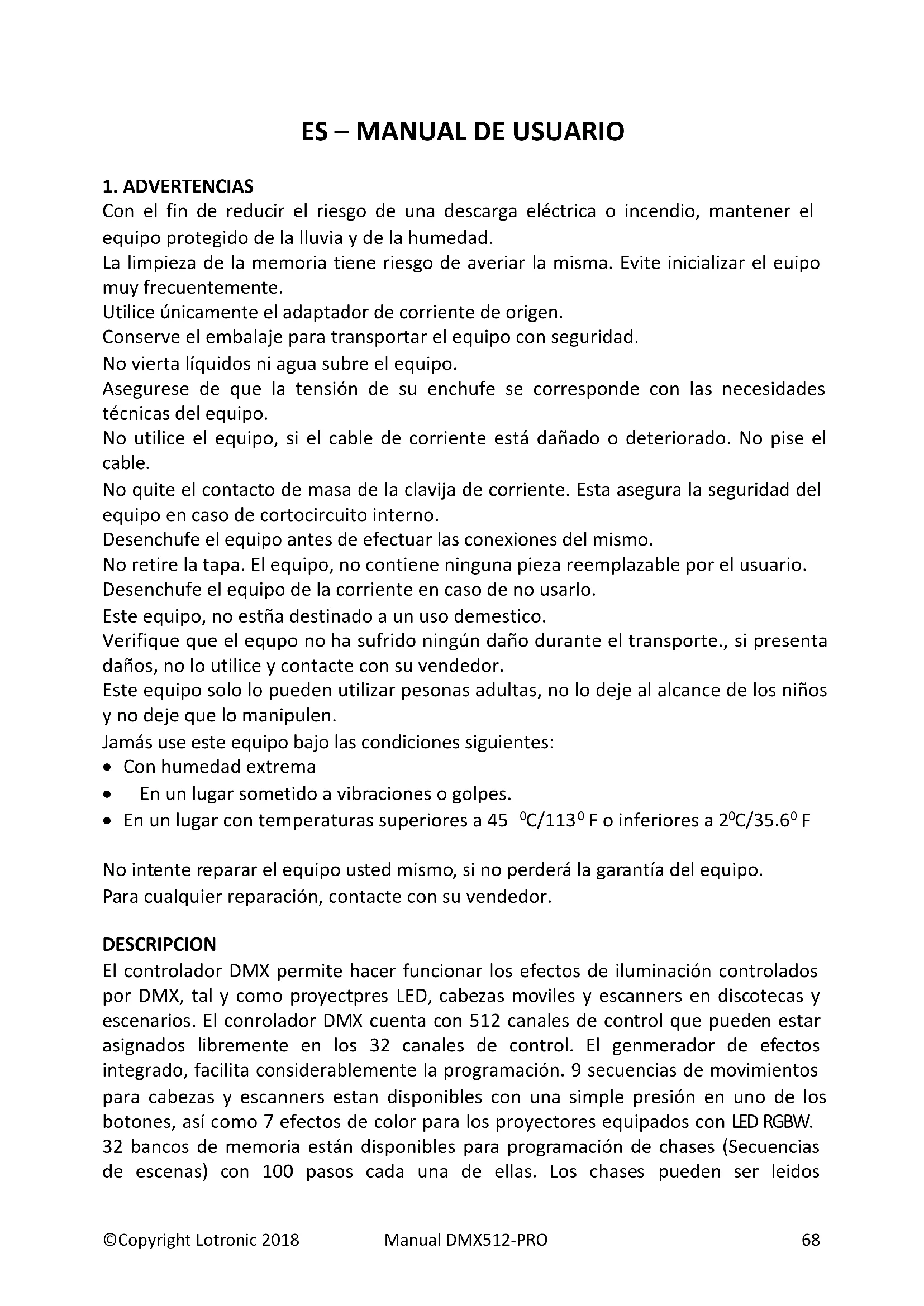 No intente reparar el equipo usted mismo, si no perderá la garantía del equipo. Para cualquier reparación, contacte con su vendedor. DESCRIPCION El controlador DMX permite hacer funcionar los efectos de iluminación controlados por DMX, tal y como proyectpres LED, cabezas moviles y escanners en discotecas y escenarios. El conrolador DMX cuenta con 512 canales de control que pueden estar asignados libremente en los 32 canales de control. El genmerador de efectos integrado, facilita considerablemente la programación. 9 secuencias de movimientos para cabezas y escanners estan disponibles con una simple presión en uno de los botones, así como 7 efectos de color para los proyectores equipados con LED RGBW. 32 bancos de memoria están disponibles para programación de chases (Secuencias de escenas) con 100 pasos cada una de ellas. Los chases pueden ser leidos©Copyright Lotronic 2018 Manual DMX512-PRO 69 manualmente, controlados por el sonido o automáticamente. Puede memorizar y archivar todos los cambios de su espectaculo de iluminación, en un soporte USB.