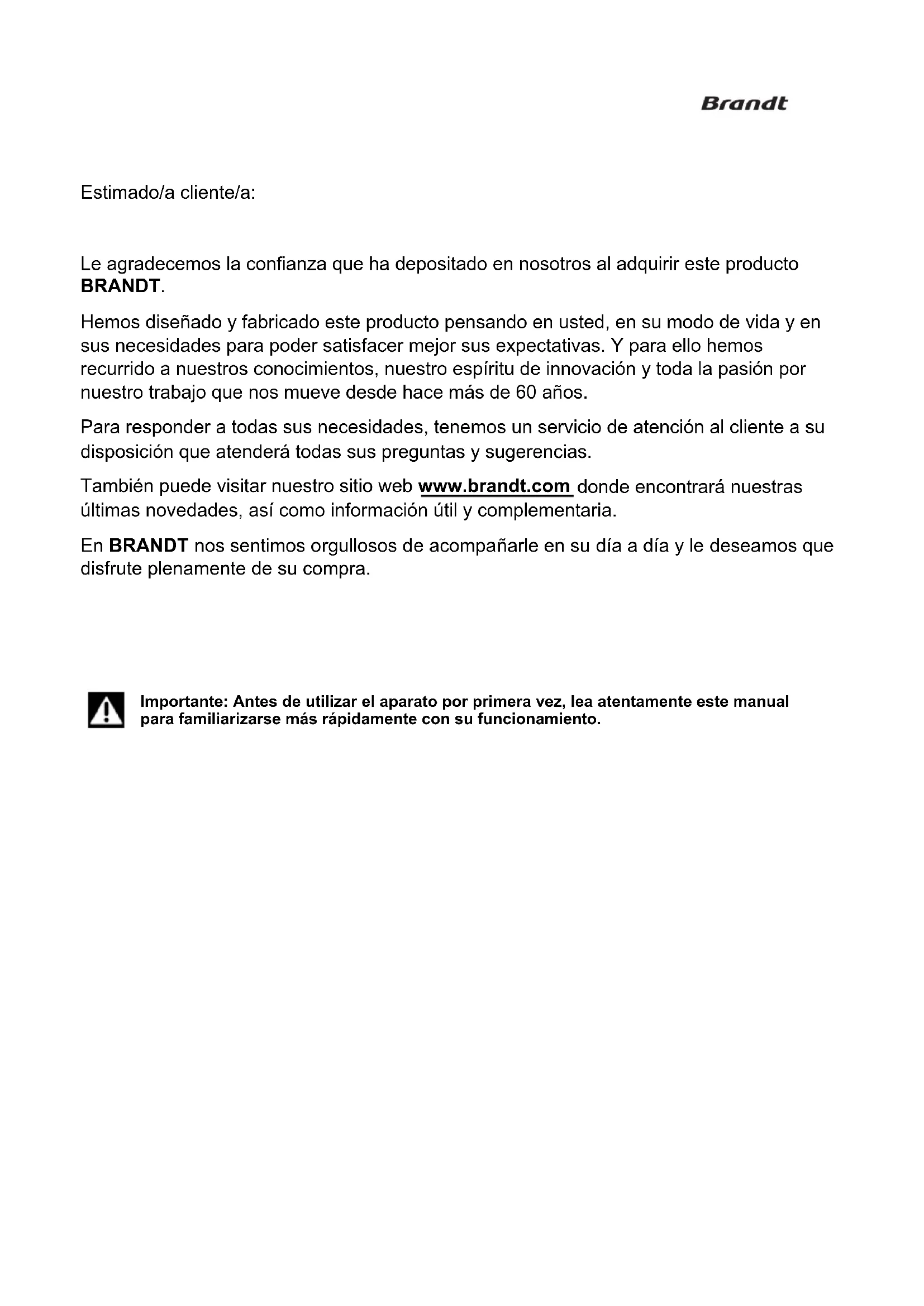Problema Causa posible Solución El aparato no funciona. El cable de alimentación principal no está conectado o está suelto. Conecte el cable de alimentación principal. El fusible se ha fundido o está defectuoso. Compruebe el fusible y cámbielo si es necesario. El enchufe está defectuoso. Las averías eléctricas deben ser resueltas por un electricista. Los bordes del frigorífico en contacto con la junta están calientes En especial en verano (temporadas de calor), las superficies en contacto con la junta de la puerta pueden estar más calientes durante en funcionamiento del compresor. Es normal. El aparato congela o enfría demasiado. El aparato está ajustado a una temperatura demasiado baja. Ajuste temporalmente el termostato a una temperatura más alta. La comida no está suficientement e congelada. La temperatura no está bien ajustada. Consulte el capítulo sobre el ajuste de la temperatura. La puerta ha estado abierta durante mucho tiempo. Abra la puerta solo cuando sea necesario.Se ha colocado una gran cantidad de comida tibia en el aparato durante las últimas 24 horas. Ajuste temporalmente el termostato a una temperatura menos alta. El aparato está cerca de una fuente de calor. Consulte el capítulo sobre el lugar de instalación. Se acumula una capa gruesa de escarcha en la junta de la puerta. La junta de la puerta no es hermética. Caliente con cuidado las partes con fugas de la junta de la puerta con un secador (a temperatura baja). Al mismo tiempo, manipule la junta de la puerta calentada con las manos para comprobar la estanqueidad del aparato. Cae agua al suelo. El orificio de evacuación está obstruido. Consulte el capítulo sobre limpieza y mantenimiento. Las paredes del aparato están calientes. Es normal. Las piezas del intercambiador de calor están en las paredes. Póngase guantes para tocar las paredes si es necesario. Suena la alarma de apertura de puerta (según modelo). La puerta del frigorífico y/o del congelador se ha dejado abierta durante demasiado tiempo. Cierre la puerta. Ruidos anormales El aparato no está nivelado. Reajuste las patas. El aparato golpea la pared u otros objetos. Mueva un poco el aparato. Un componente (p. ej.: un tubo) situado en la parte posterior del aparato toca otra parte del aparato o la pared. Si es necesario, doble con cuidado el componente para disponer de más espacio. Puede que se escuchen ruidos durante el funcionamiento normal del aparato (ciclo de funcionamiento del compresor, descongelación automática, circulación de gas refrigerante dentro del aparato, etc.). Si no encuentra el origen de la avería o el problema de funcionamiento, contacte con nuestro servicio posventa autorizado o con un profesional cualificado.Piezas originales Para cualquier intervención de mantenimiento, pida que se utilicen exclusivamente piezas de recambio originales. El periodo mínimo de disponibilidad de las piezas de recambio incluidas en la lista del Reglamento Europeo 2019-2019-UE y accesibles para el usuario del aparato es de 10 años en las condiciones previstas por este mismo reglamento. Garantía Contacte con su distribuidor para beneficiarse de la garantía. El fabricante no ofrece ninguna garantía comercial para el frigorífico.Αγαπητοί πελάτες, Σας ευχαριστούμε που αγοράσατε ένα προϊόν BRANDT και για την εμπιστοσύνη σας στην εταιρεία μας. Αυτό το προϊόν σχεδιάστηκε και κατασκευάστηκε με γνώμονα εσάς, τον τρόπο ζωής σας, τις ανάγκες σας, ώστε να ανταποκρίνεται όσο το δυνατόν καλύτερα στις προσδοκίες σας. Εμπεριέχει την τεχνογνωσία και το πνεύμα καινοτομίας της εταιρείας, αλλά και το πάθος που μας οδηγεί εδώ και περισσότερα από 60 χρόνια. Μεριμνούμε πάντοτε, ώστε να ικανοποιούμε όλο και καλύτερα τις απαιτήσεις σας. Η υπηρεσία εξυπηρέτησης πελατών είναι στη διάθεσή σας προκειμένου να απαντήσει σε όλες τις ερωτήσεις σας και να καταγράψει τις προτάσεις σας. Επισκεφθείτε επίσης τον δικτυακό μας τόπο www.brandt.com προκειμένου να ενημερωθείτε για τις τελευταίες καινοτομίες μας και να αντλήσετε χρήσιμες επιπλέον πληροφορίες. Είναι μεγάλη μας χαρά που η BRANDT θα είναι μέρος της καθημερινότητάς σας και ευχόμαστε να αξιοποιήσετε στο έπακρο την αγορά σας.