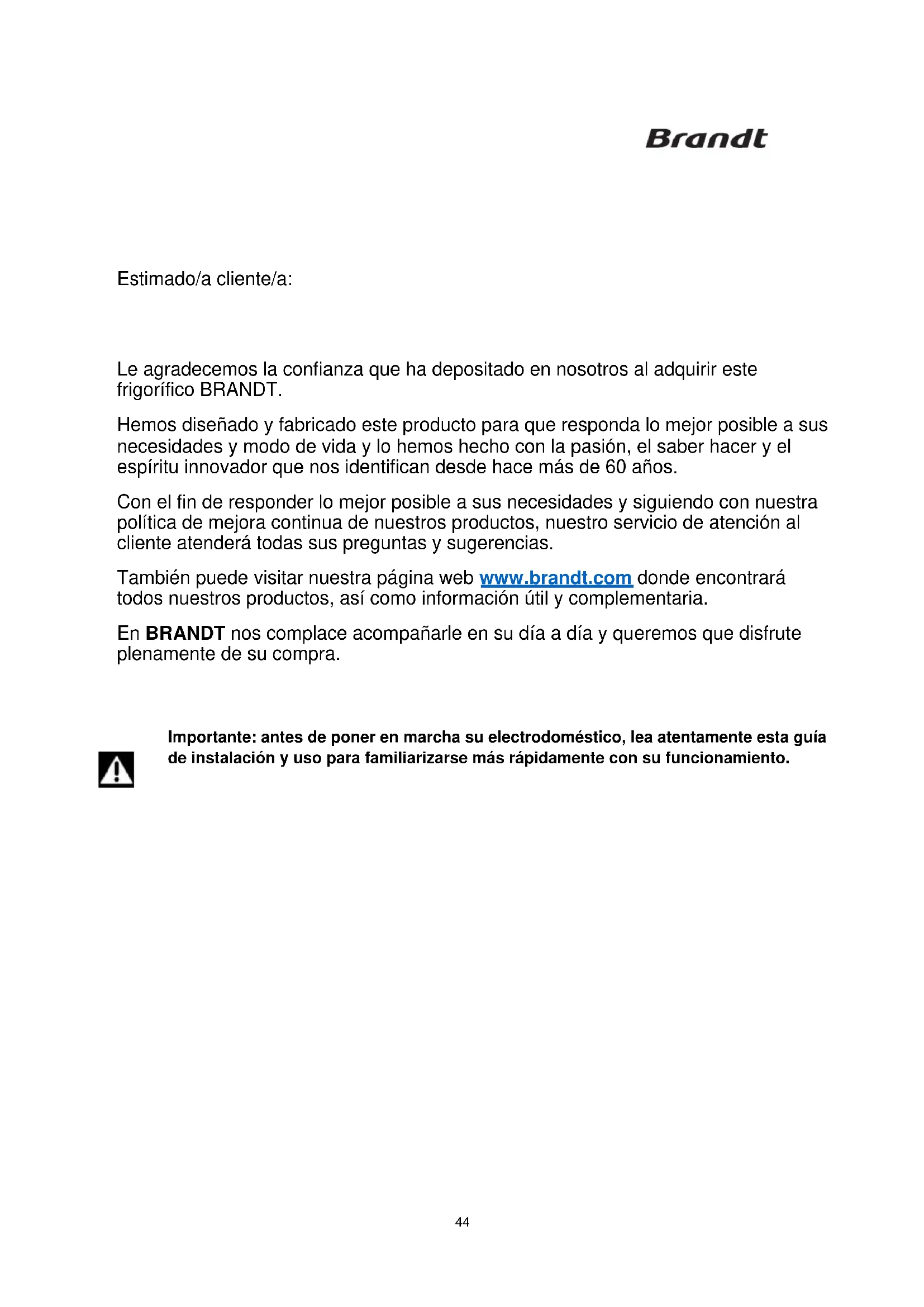 Le agradecemos la confianza que ha depositado en nosotros al adquirir este frigorífico BRANDT. Hemos diseñado y fabricado este producto para que responda lo mejor posible a sus necesidades y modo de vida y lo hemos hecho con la pasión, el saber hacer y el espíritu innovador que nos identifican desde hace más de 60 años. Con el fin de responder lo mejor posible a sus necesidades y siguiendo con nuestra política de mejora continua de nuestros productos, nuestro servicio de atención al cliente atenderá todas sus preguntas y sugerencias. También puede visitar nuestra página web www.brandt.com donde encontrará todos nuestros productos, así como información útil y complementaria. En BRANDT nos complace acompañarle en su día a día y queremos que disfrute plenamente de su compra.