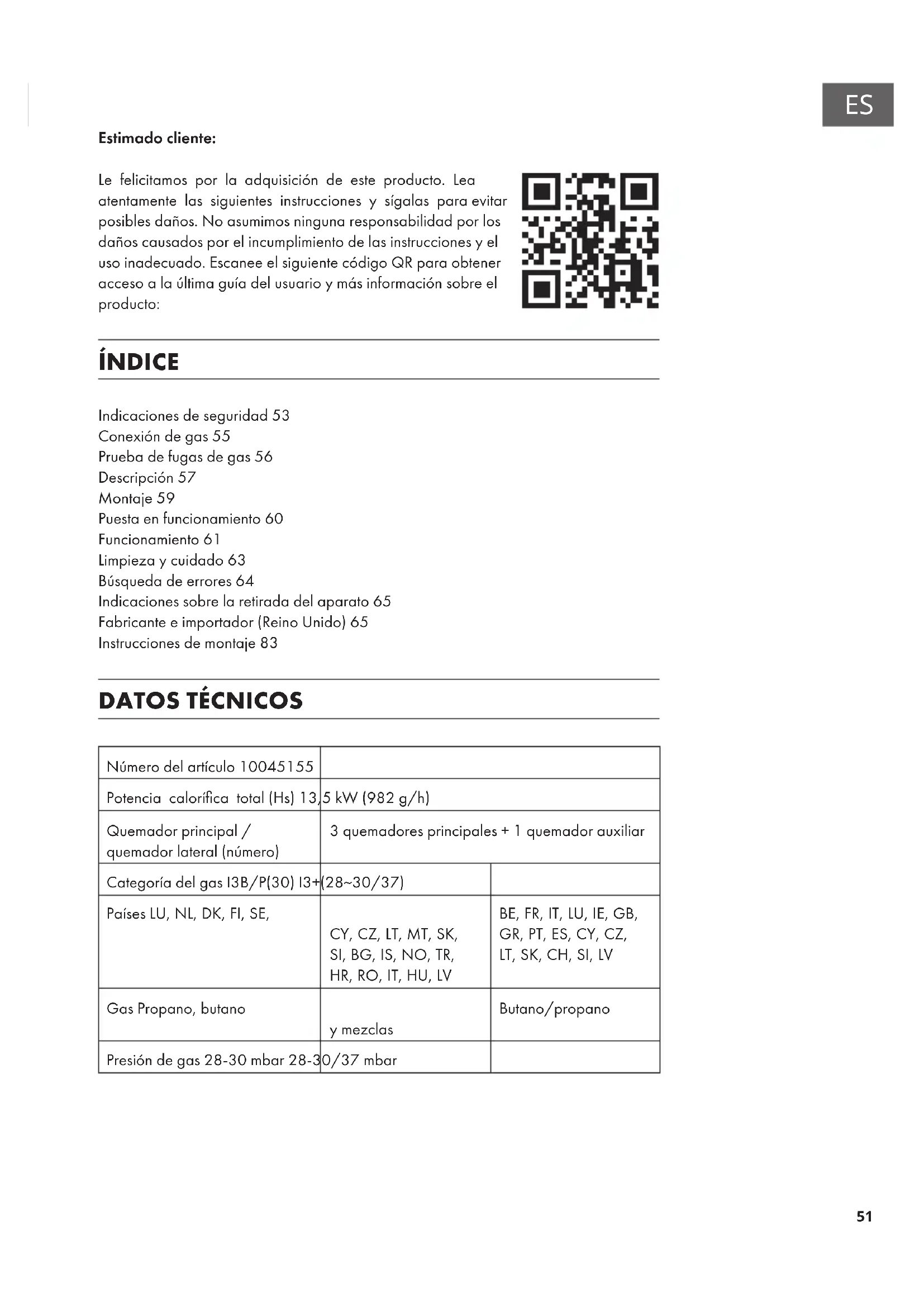Estimado cliente: Le felicitamos por la adquisición de este producto. Lea atentamente las siguientes instrucciones y sígalas para evitar posibles daños. No asumimos ninguna responsabilidad por los daños causados por el incumplimiento de las instrucciones y el uso inadecuado. Escanee el siguiente código QR para obtener acceso a la última guía del usuario y más información sobre el producto: ÍNDICE Indicaciones de seguridad53 Conexión de gas55 Prueba de fugas de gas56 Descripción57 Montaje59 Puesta en funcionamiento60 Funcionamiento61 Limpieza y cuidado63 Búsqueda de errores64 Indicaciones sobre la retirada del aparato65 Fabricante e importador (Reino Unido)65 Instrucciones de montaje83