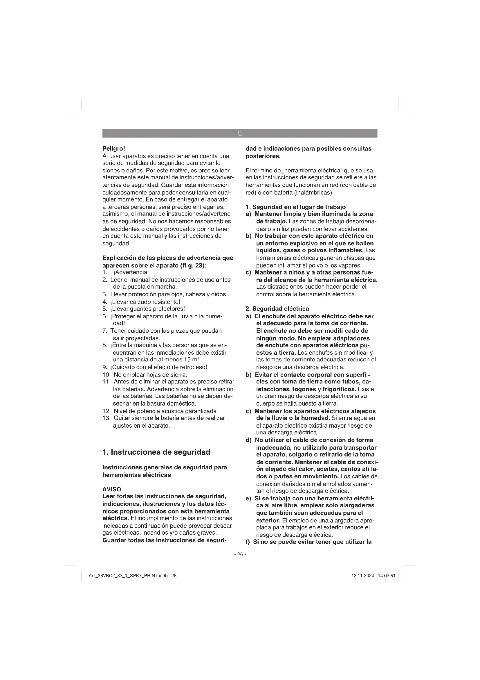 eléctrica a) No sobrecargar la herramienta eléctrica. Usar la herramienta eléctrica específi ca para cada trabajo. Con la herramienta elé- ctrica adecuada se trabaja mejor y con más seguridad permaneciendo dentro de la po- tencia indicada. b) No usar ninguna herramienta eléctrica cuyo interruptor esté defectuoso. Una her- ramienta eléctrica que ya no pueda conectar- se o desconectarse conlleva peligros y debe repararse. c) Desenchufar el cable de la toma de corri- ente y/o retirar la batería antes de ajustar el aparato, cambiar accesorios o abando- nar la herramienta eléctrica. Esta medida de seguridad evita que la herramienta eléctri- ca arranque accidentalmente. d) Guardar las herramientas eléctricas que no se usen fuera del alcance de los niños. No permitir el uso de la herramienta eléctrica a personas que no estén famili- arizadas con ello o no hayan leído estas instrucciones. Las herramientas eléctricas son peligrosas si las usan personas sin expe- riencia. e) Tratar las herramientas eléctricas y las insertables con cuidado. Comprobar que las piezas móviles funcionen de forma correcta y no se bloqueen, controlar también si existen piezas rotas o están tan dañadas que ponen en peligro el fun- cionamiento de la herramienta eléctrica. Reparar las piezas dañadas antes de usar la herramienta eléctrica. Numerosos acci- dentes se deben a herramientas eléctricas mal cuidadas. f) Mantener limpias y afi ladas las herrami- entas de corte. Las herramientas de corte bien cuidadas con cantos afi lados se bloque- an con menor frecuencia y pueden manejar- se de forma más sencilla. g) Respetar estas instrucciones cuando se desee utilizar la herramienta eléctrica, los accesorios, piezas de recambio, etc. Para ello, tener en cuenta las condiciones de Anl_36VBC2_33_1_SPK7_PRINT.indb 27Anl_36VBC2_33_1_SPK7_PRINT.indb 27 12.11.2024 14:03:5112.11.2024 14:03:51E